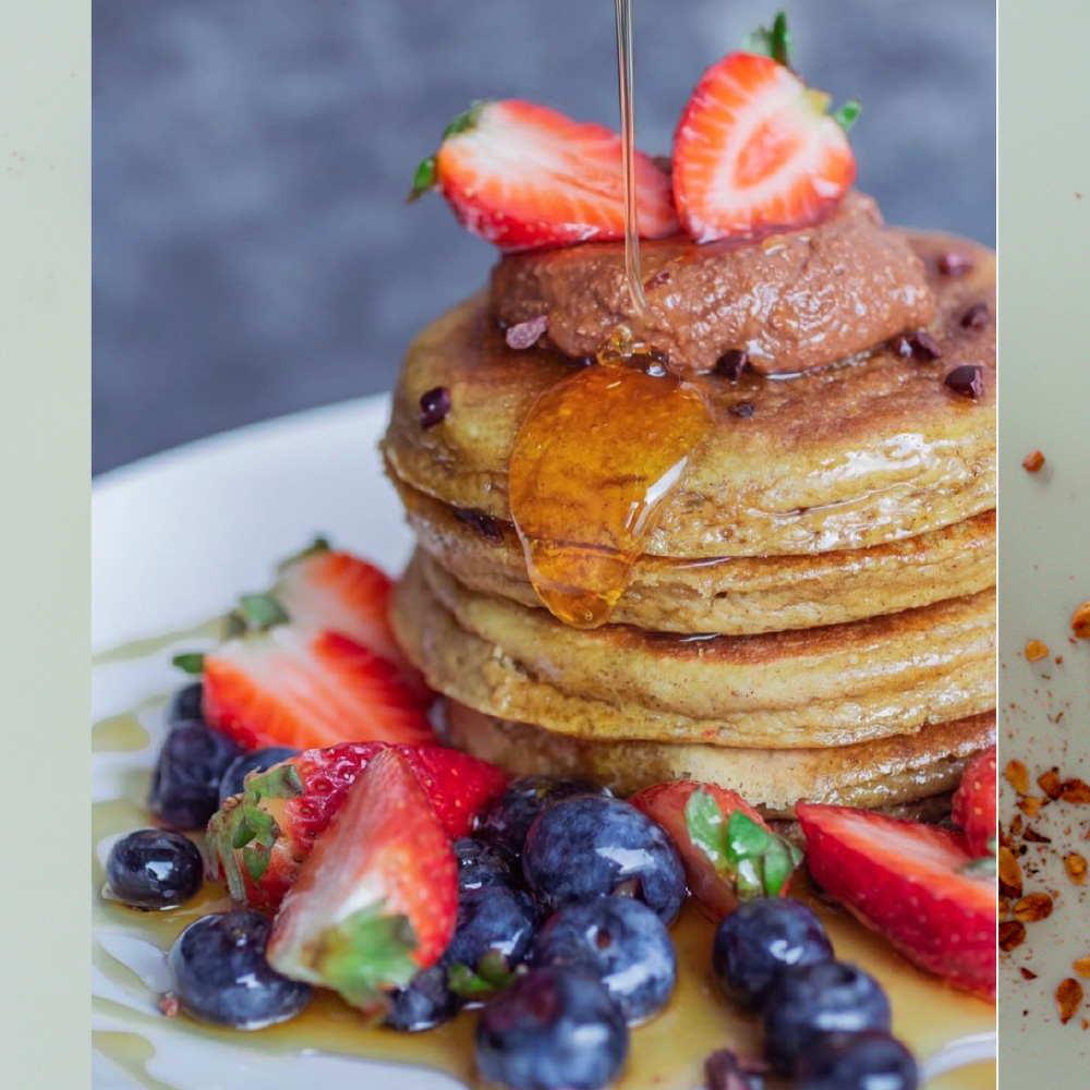Panqueques a base de clara y harina de avena y sabor a elegir. Acompañado de 4 toppings a elección.