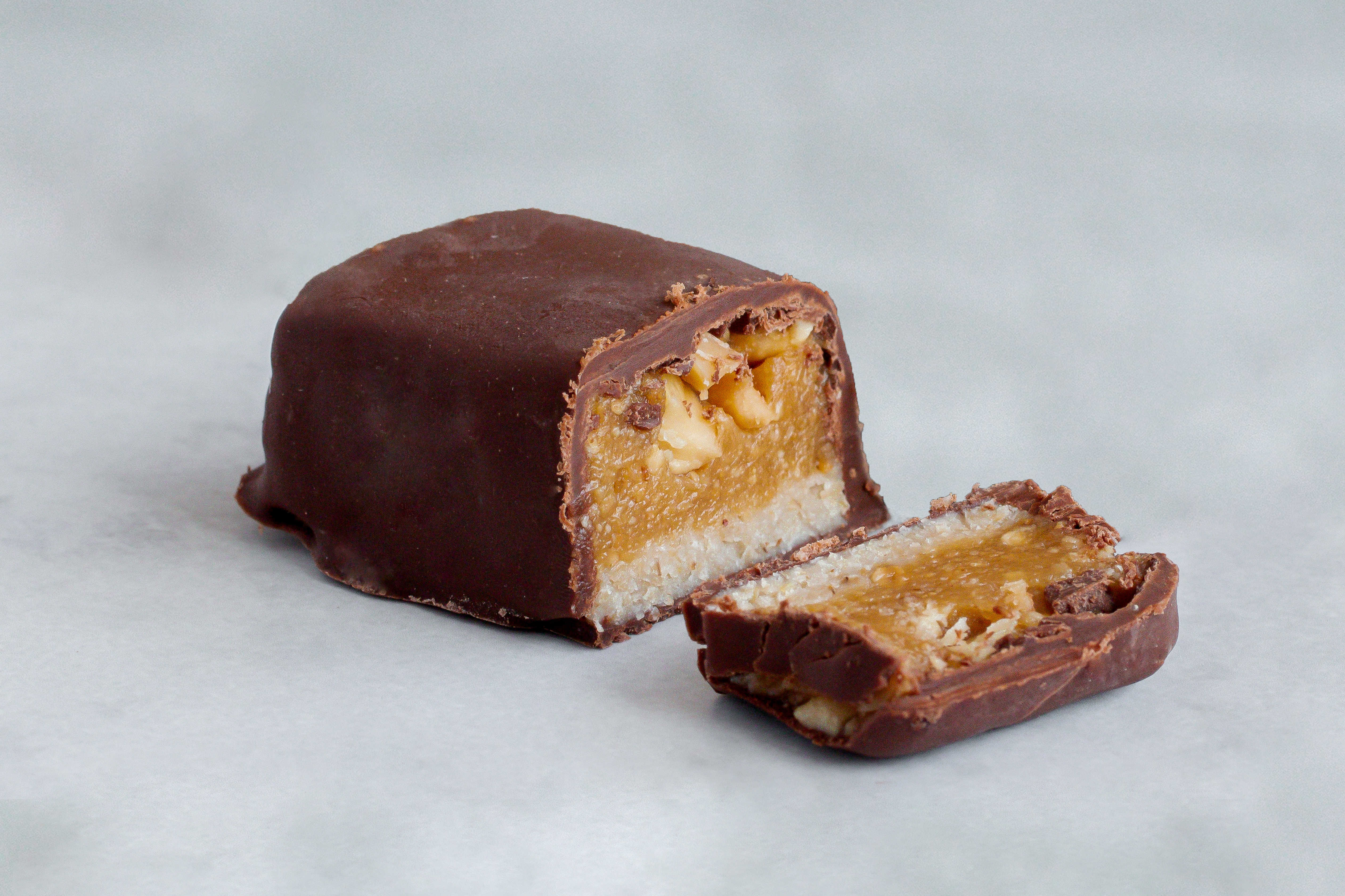 Una increíble barrita de chocolate bitter rellena con una mistura de avellanas, maní, aceite de coco y avena. Endulzado con Stevia y miel de agave.