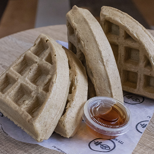 Waffles de vainilla o cacao preparado a base de avena, linaza y claras de huevo.