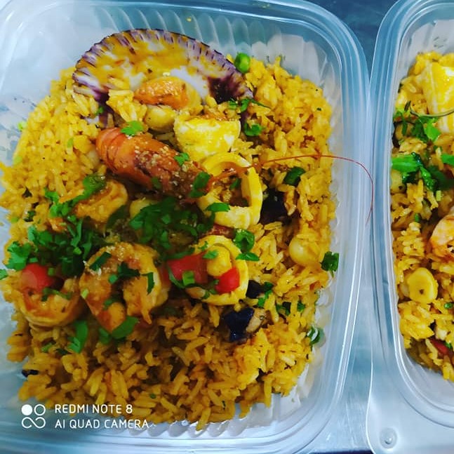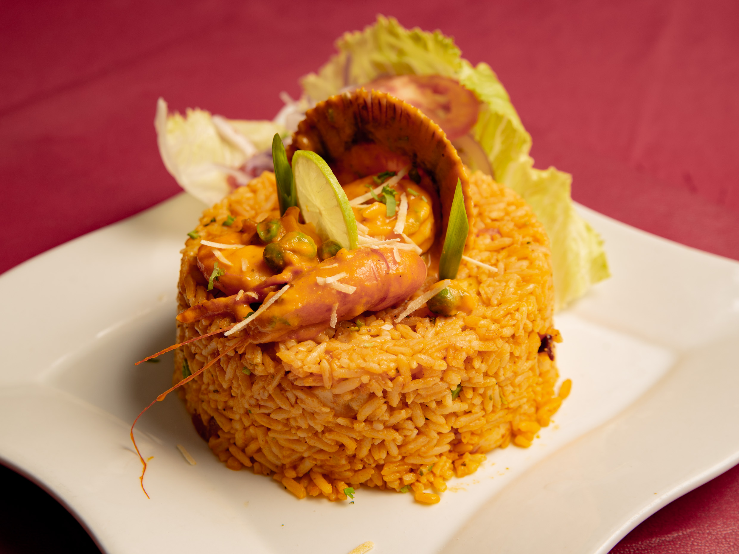 Un plato de una deliciosa preparación que combina el sabor y la textura del arroz con una gran variedad de mariscos acompañado de sarza criolla.