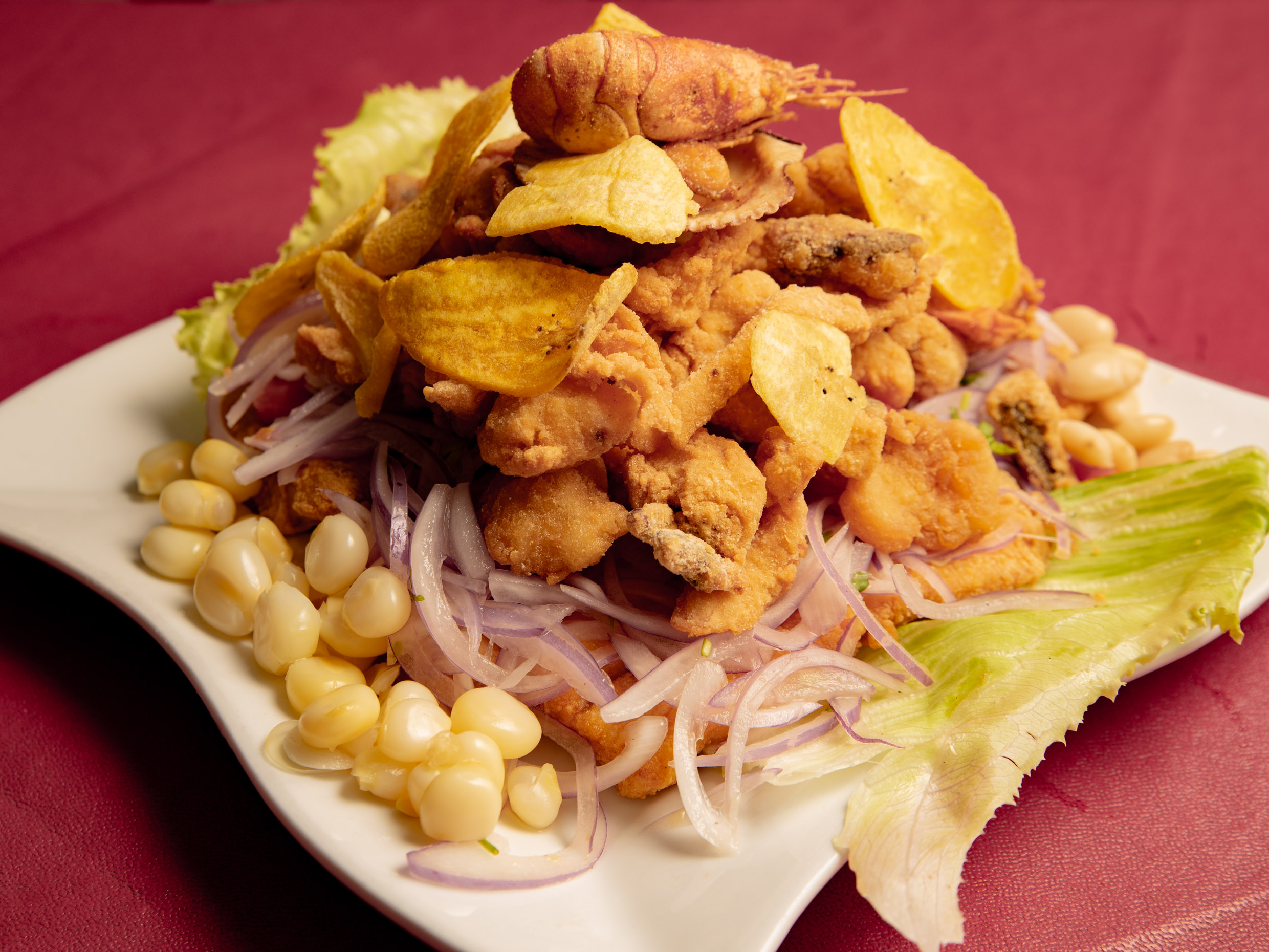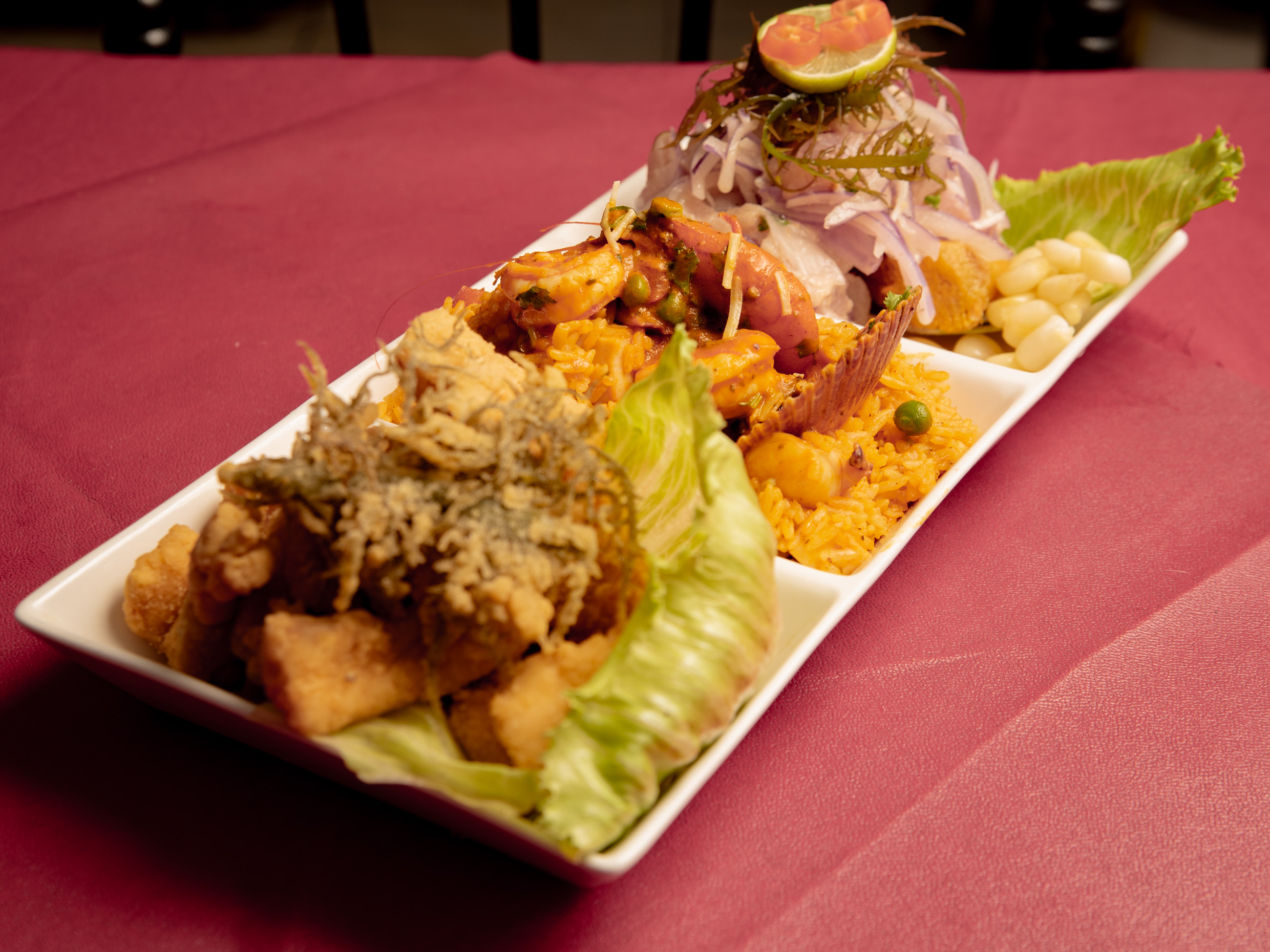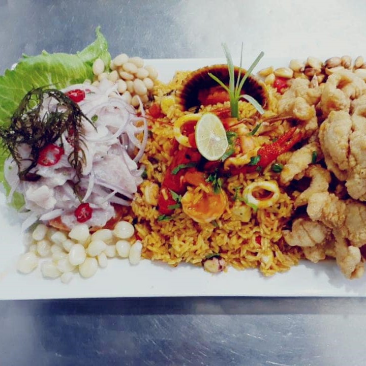 Ceviche, chicharrón más arroz chaufa con mariscos.
