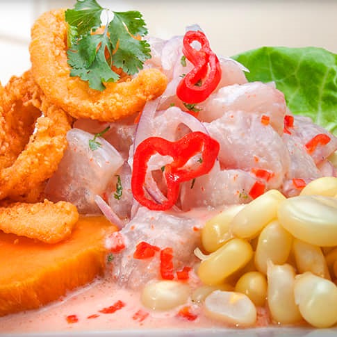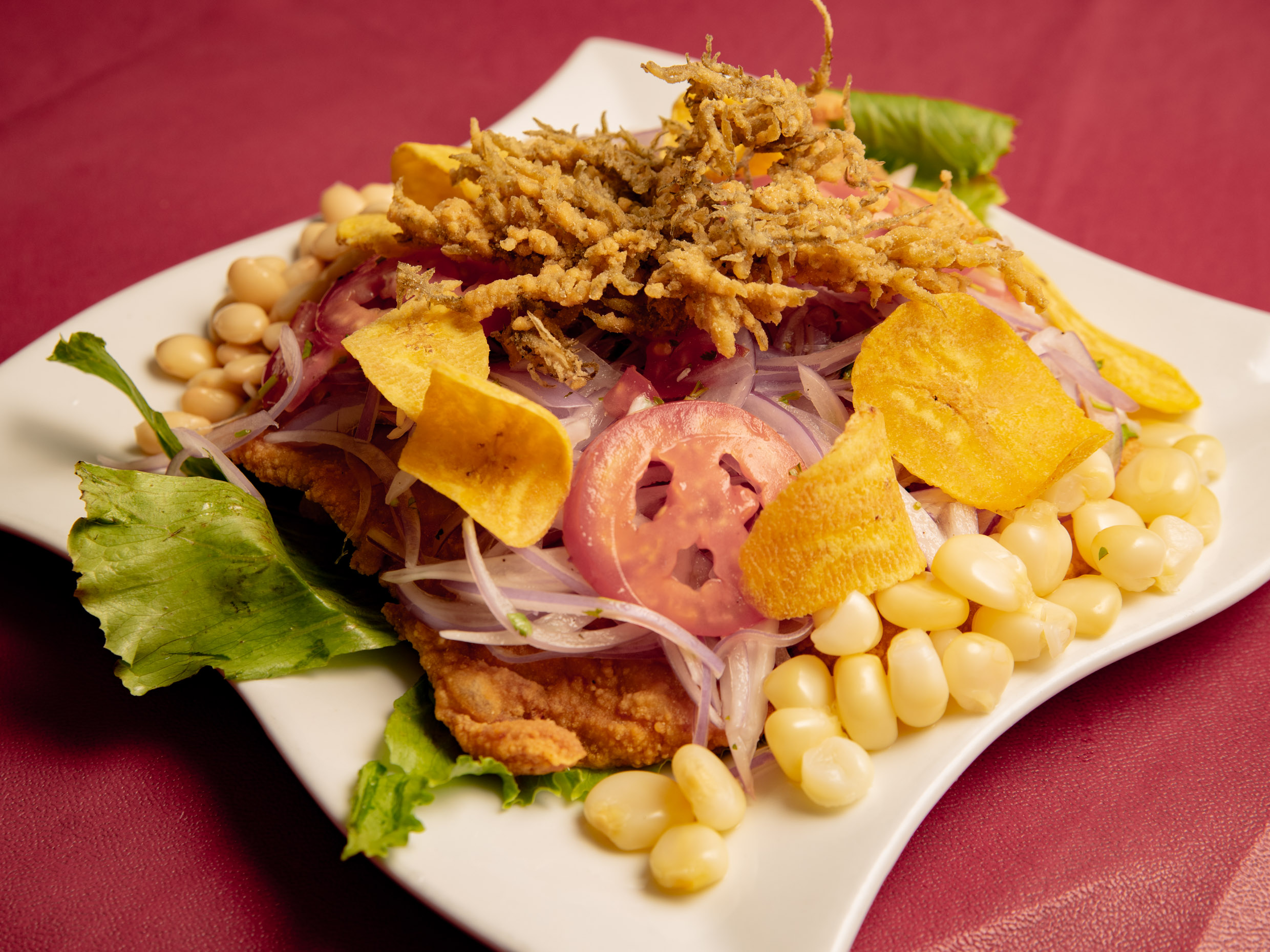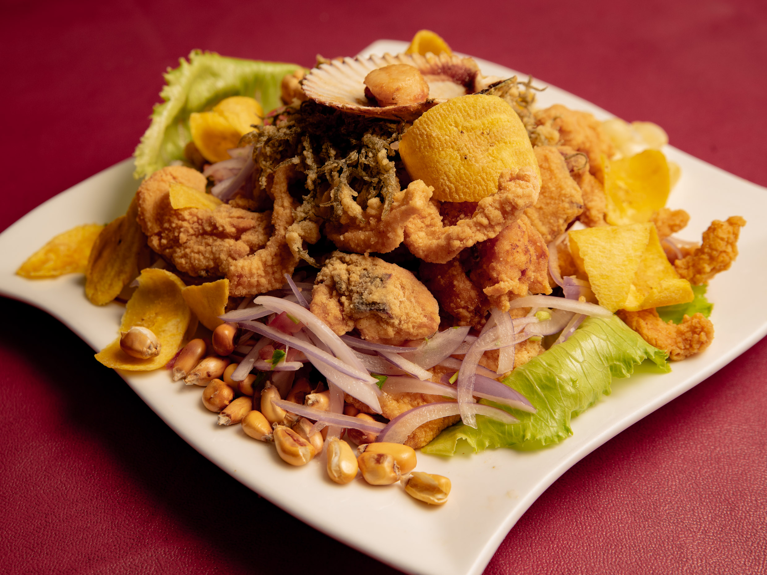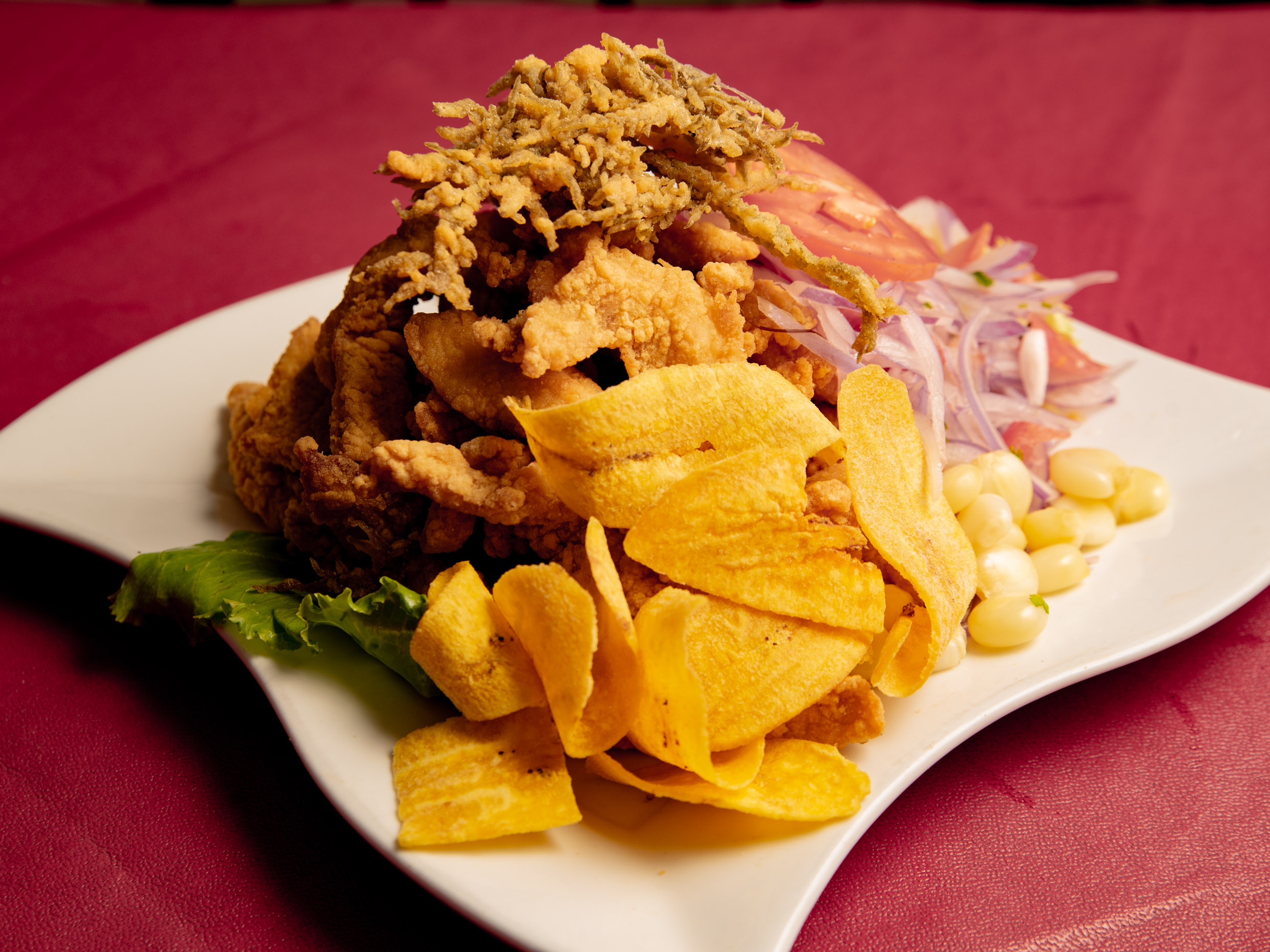 Ceviche, chicharrón más arroz chaufa con mariscos.