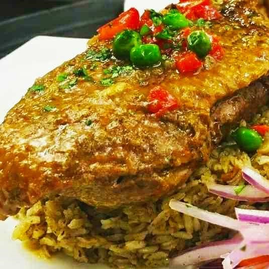 Un plato que consta de arroz y una pieza de cabrito acompañado de sarza criolla.
