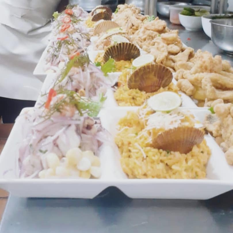 Ceviche de Conchas negras, chicharrón más arroz con mariscos.
