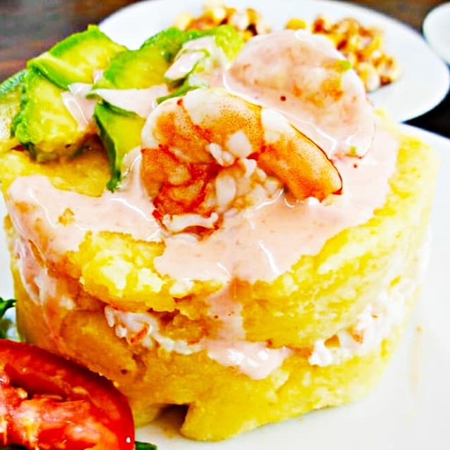 Hecho de plátano verde, carne de res con un aliño de cebolla y tomate acompañado con sarza criolla.