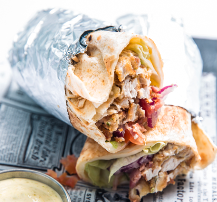 Tortilla, pollo, jamón, queso, papa al hilo, encurtido de nabo, cremas y salsas al gusto (mayonesa, kétchup, crema de ají, salsa golf, salsa tártara y mostaza).