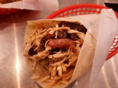Tortilla, carne, queso, papa al hilo, encurtido de nabo, cremas y salsas al gusto (mayonesa, kétchup, crema de ají, salsa golf, salsa tártara y mostaza).