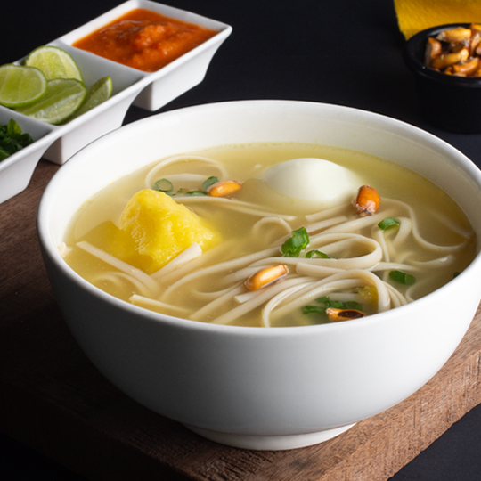 Al estilo único de la sopería, con una textura especial y diferente a la clásica, presa a elección (pecho con ala / pecho / pierna / encuentro), papa amarilla, huevo y fideos tallarín.