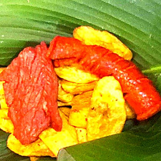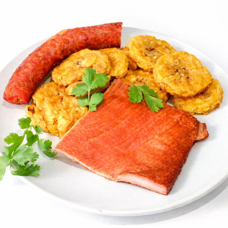 Porción de plátanos bellacos fritos + cecina + chorizo. Acompáñalo con nuestro único y delicioso ají de cocona de la casa.