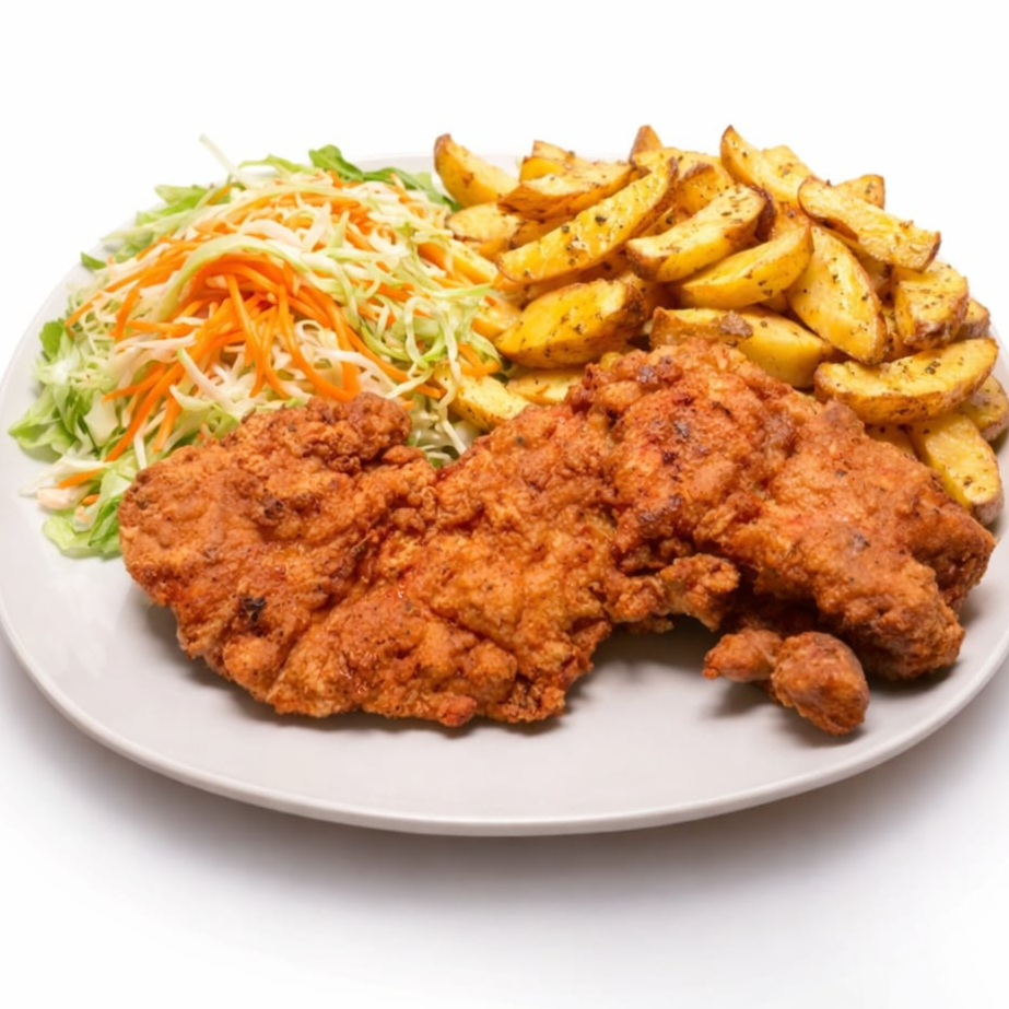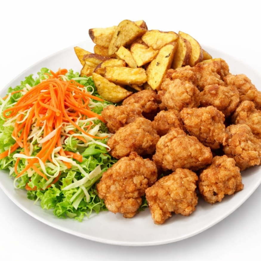 Jugosos chicharrones de pollo, papas crujientes y ensalada fresca.