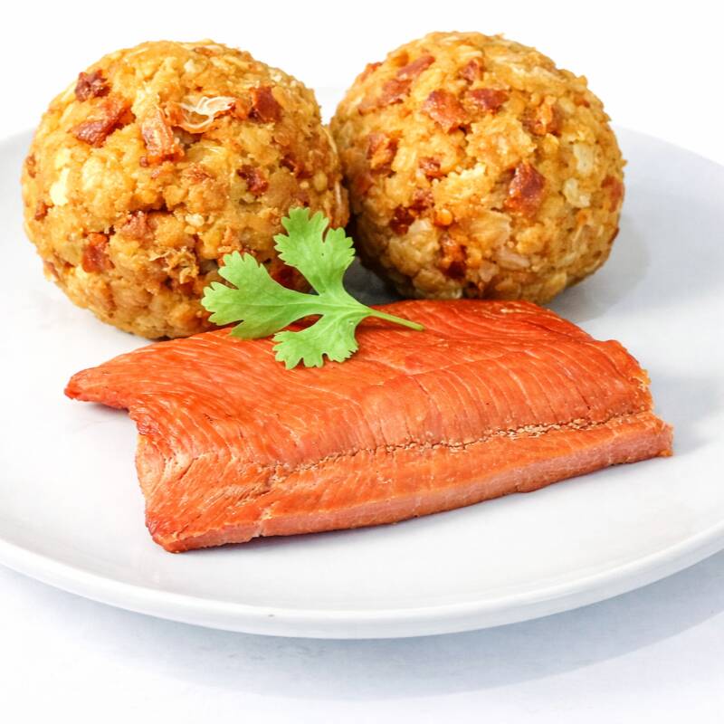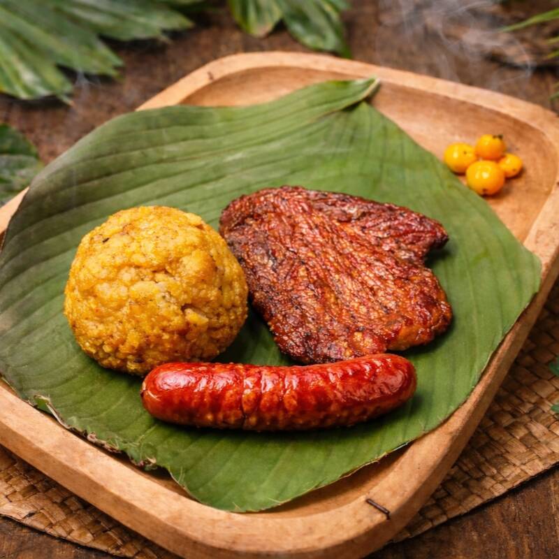 1 Bola de tacacho con trocitos de chicharrón + cecina amazónica + chorizo amazónico. Acompáñalo con nuestro rico y delicioso ají de cocona.