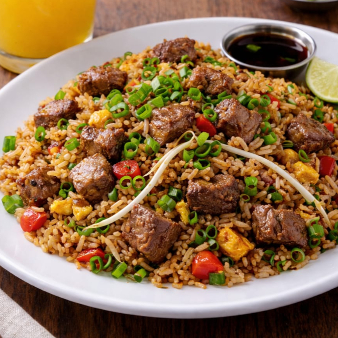 arroz chaufa con jugosos y finos trozos de carne.
