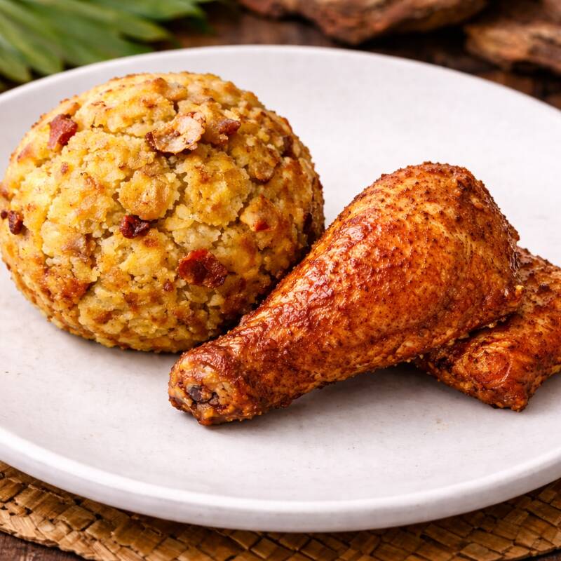 Bola de tacacho, preparado con trocitos de chicharrón. Acompáñalo con nuestro único y delicioso ají de cocona de la casa.