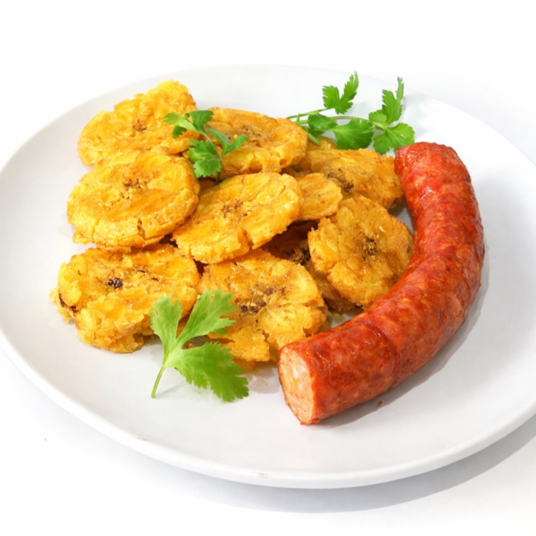 Abundantes y crocantes patacones con chorizo amazonico. Acompáñalo con nuestro único y delicioso ají de cocona de la casa.