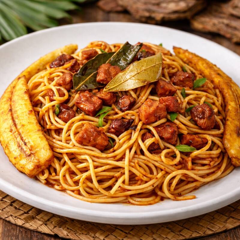 jugosos tallarines con finos trozos de cecina y chorizo amazónico, preparado con salsa secreta de la casa, acompañado de maduros fritos y aji de cocona.