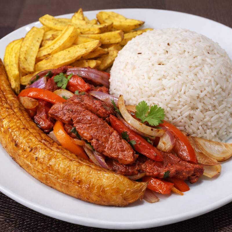 jugoso lomo saltado de cecina, acompáñalo con arroz blanco y papas amarillas crocantes.