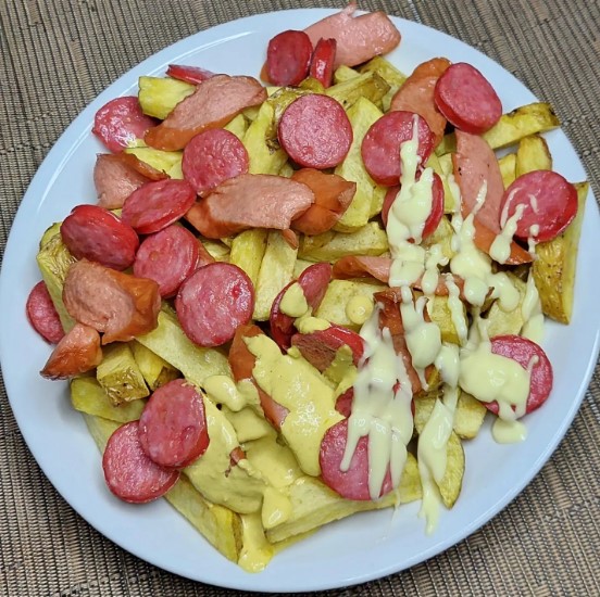 Queso mozzarella, hot dog, salame, salchichón, trozos de pollo dorado, papas fritas clásicas y ensalada.