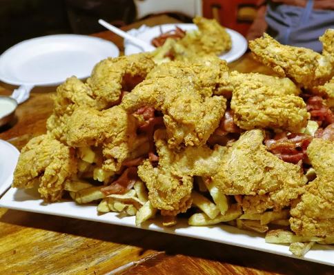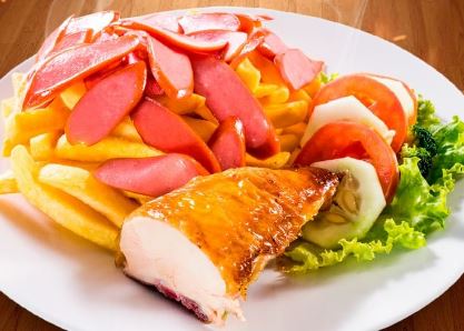 2 Filete de pollo con queso edam, tocino, hot dog, chorizo, huevo frito, papas fritas, clásicas y ensalada.