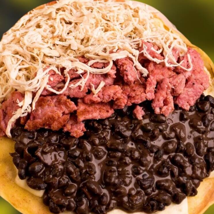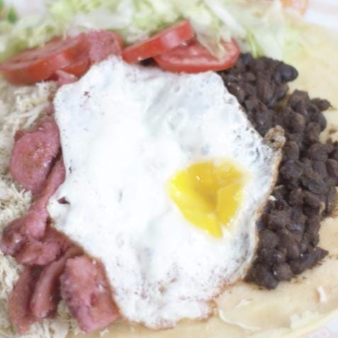 Tortilla de maíz con frijol negro, pollo deshilachado, chorizo parrillero y huevo.