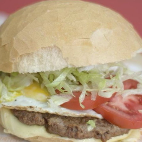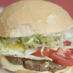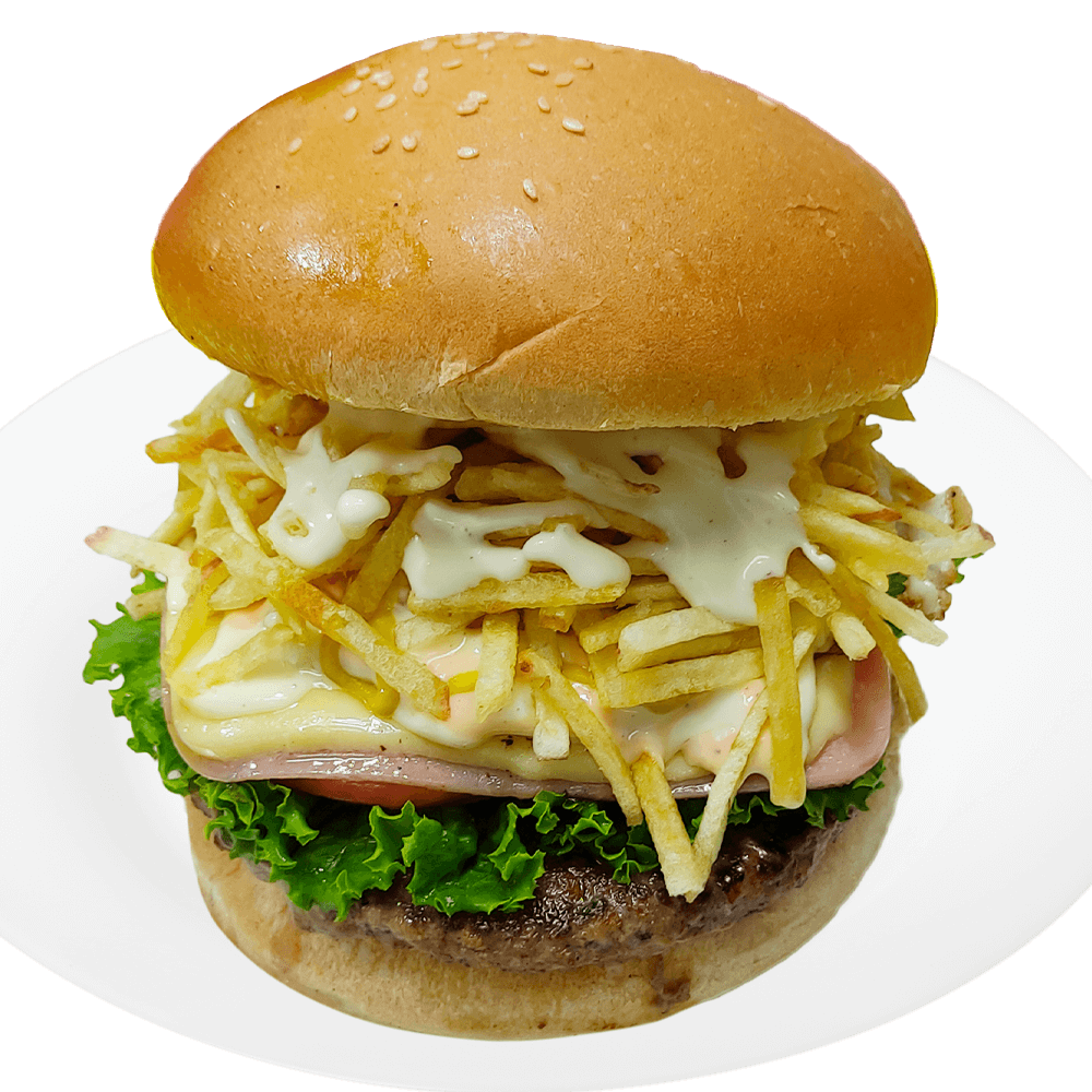 Pan, hamburguesa artesanal 120 g, jamón, queso danbo y huevo.