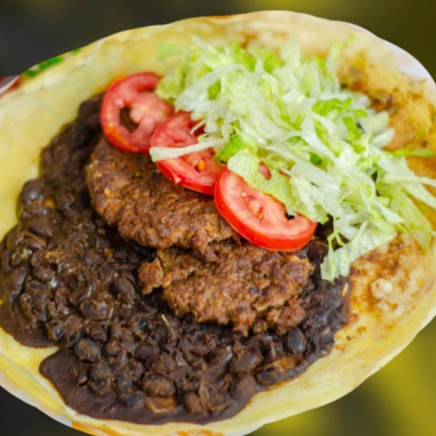 Tortilla de maíz con frijol negro y carne de hamburguesa 120 g.
