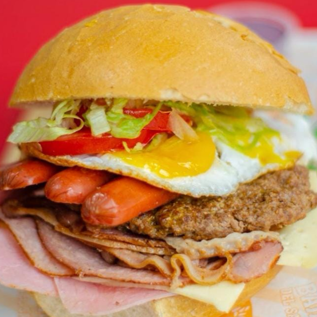 Pan, hamburguesa artesanal 120 g, jamón, queso dambo, huevo, tocino y hot dog.
