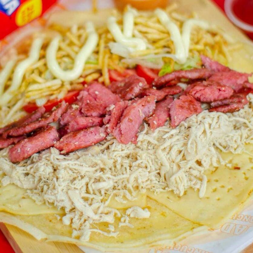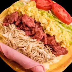 Tortilla de maíz con doble queso dambo, pollo deshilachado, chorizo parrillero, jamón y huevo.