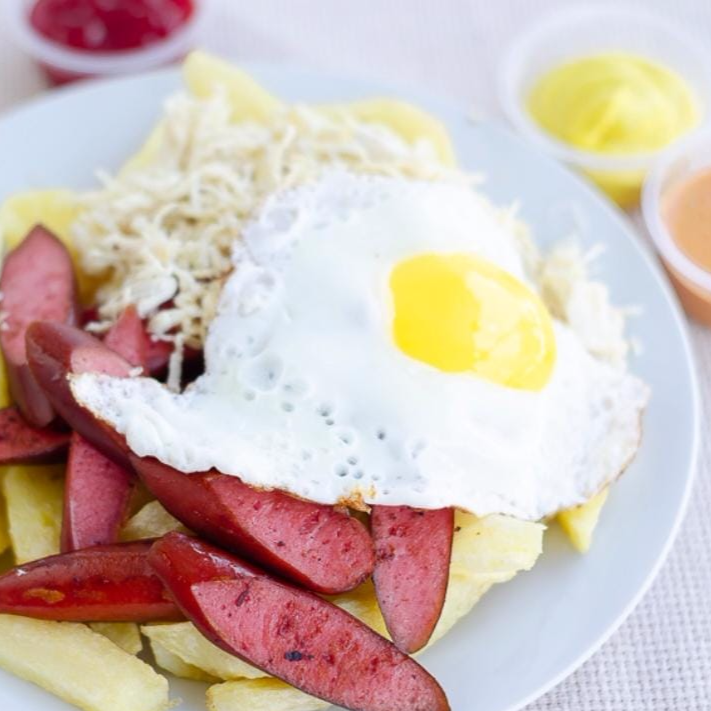 Papas fritas, hot dog, pollo deshilachado y huevo.