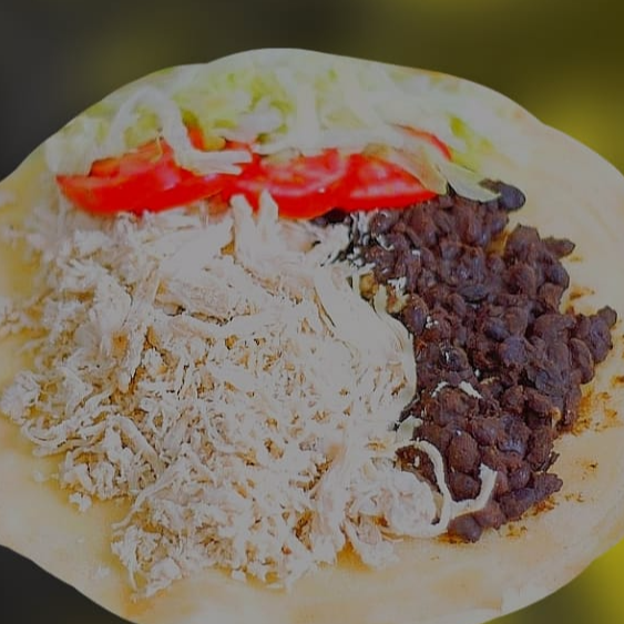 Tortilla de maíz con frijol negro y pollo deshilachado.
