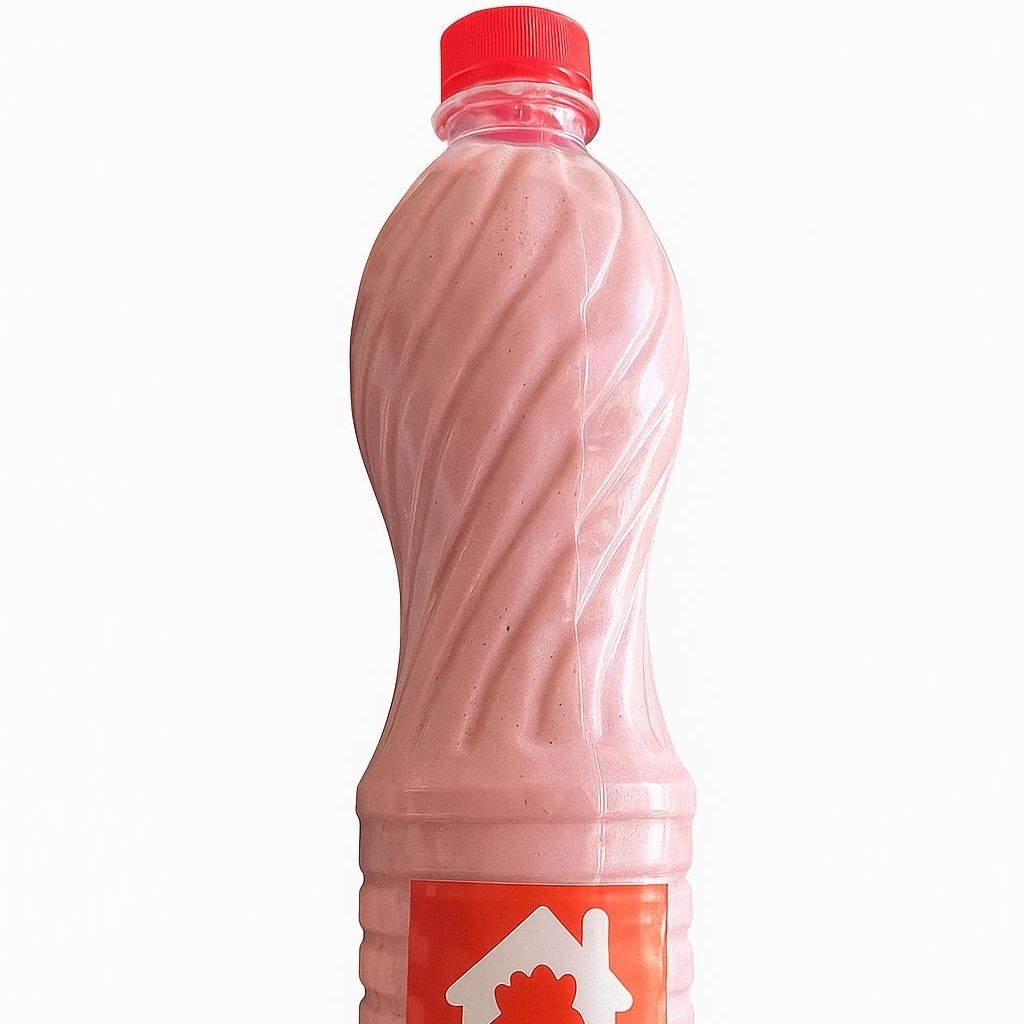 Jugo de fresa con leche entera, esta bebida sale fría. Todos los jugos se sirven en botella de 500 ml para que la bebida llegue en optimas condiciones.