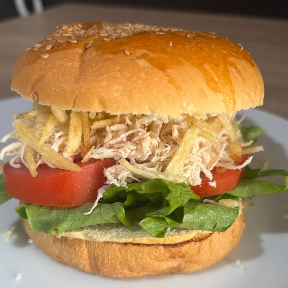 Pan croissant con pollo deshilachado combinado con una deliciosa mayonesa casera, lechuga fresa y papitas al hilo.