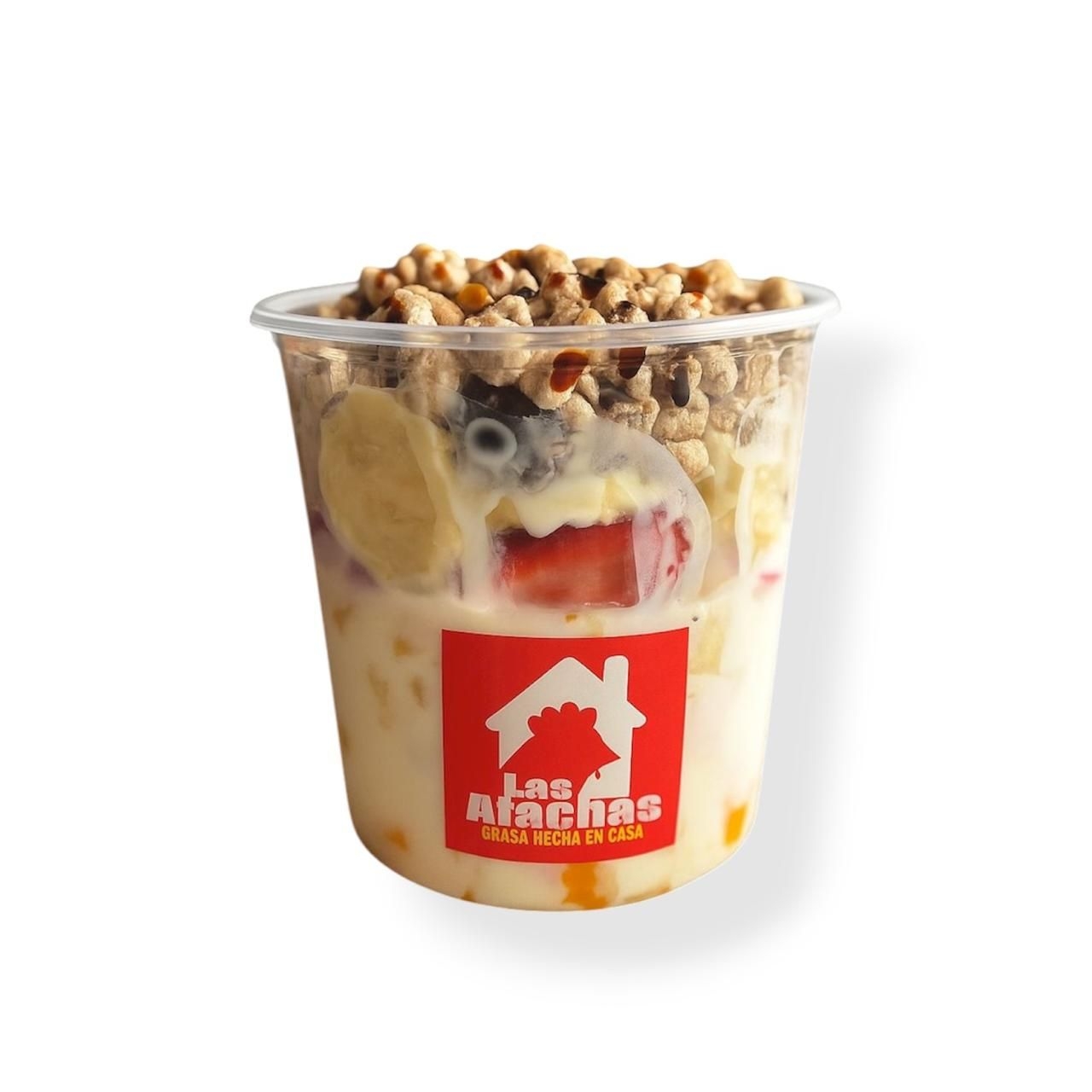 Ensalada de fruta con 4 frutas diferentes, yogurt de vainilla, trigo, miel y algarrobina, envase de 1 L.