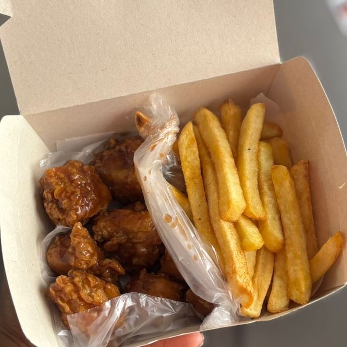 Trocitos de pollo empanizado, acompañado de papas fritas y tu salsa a elegir.