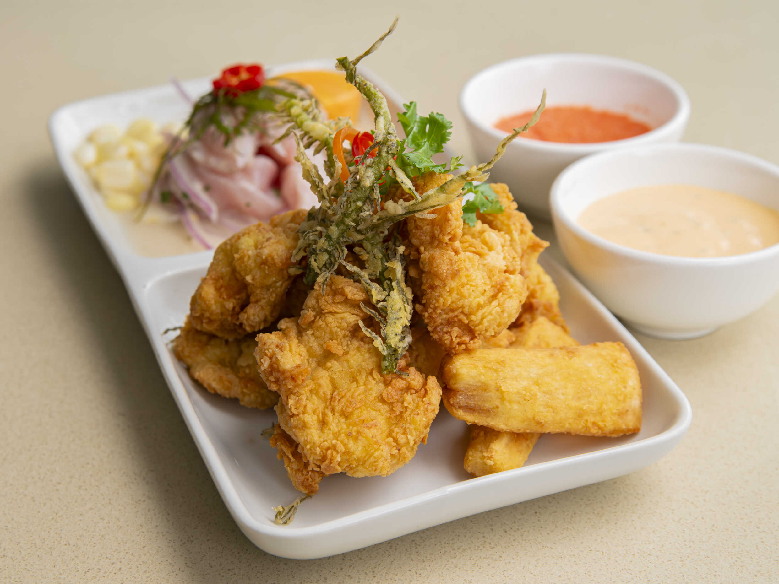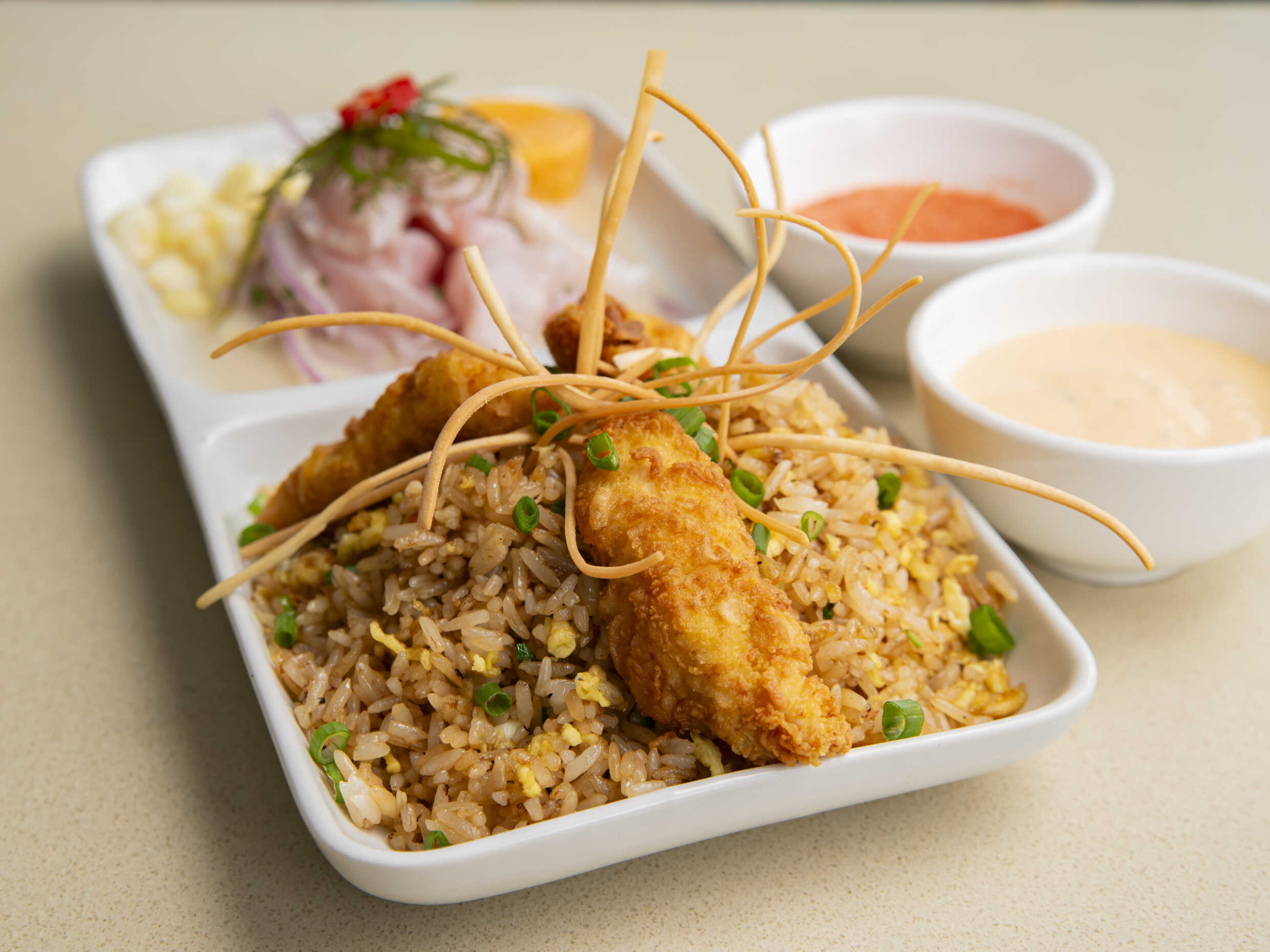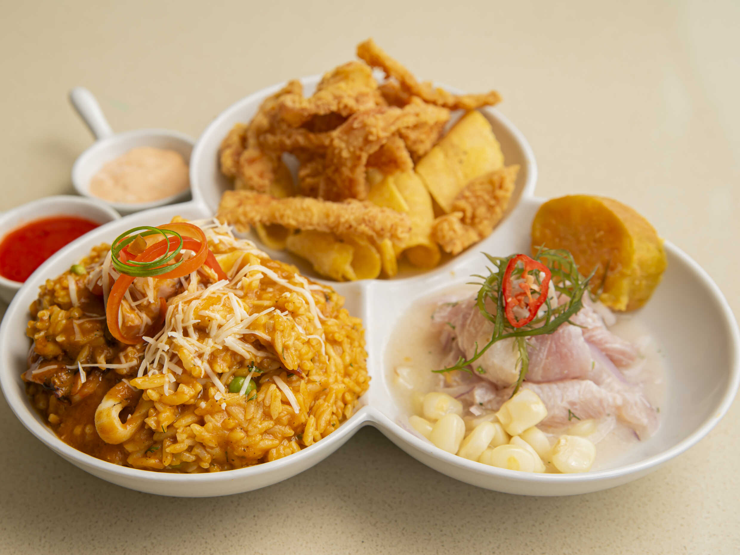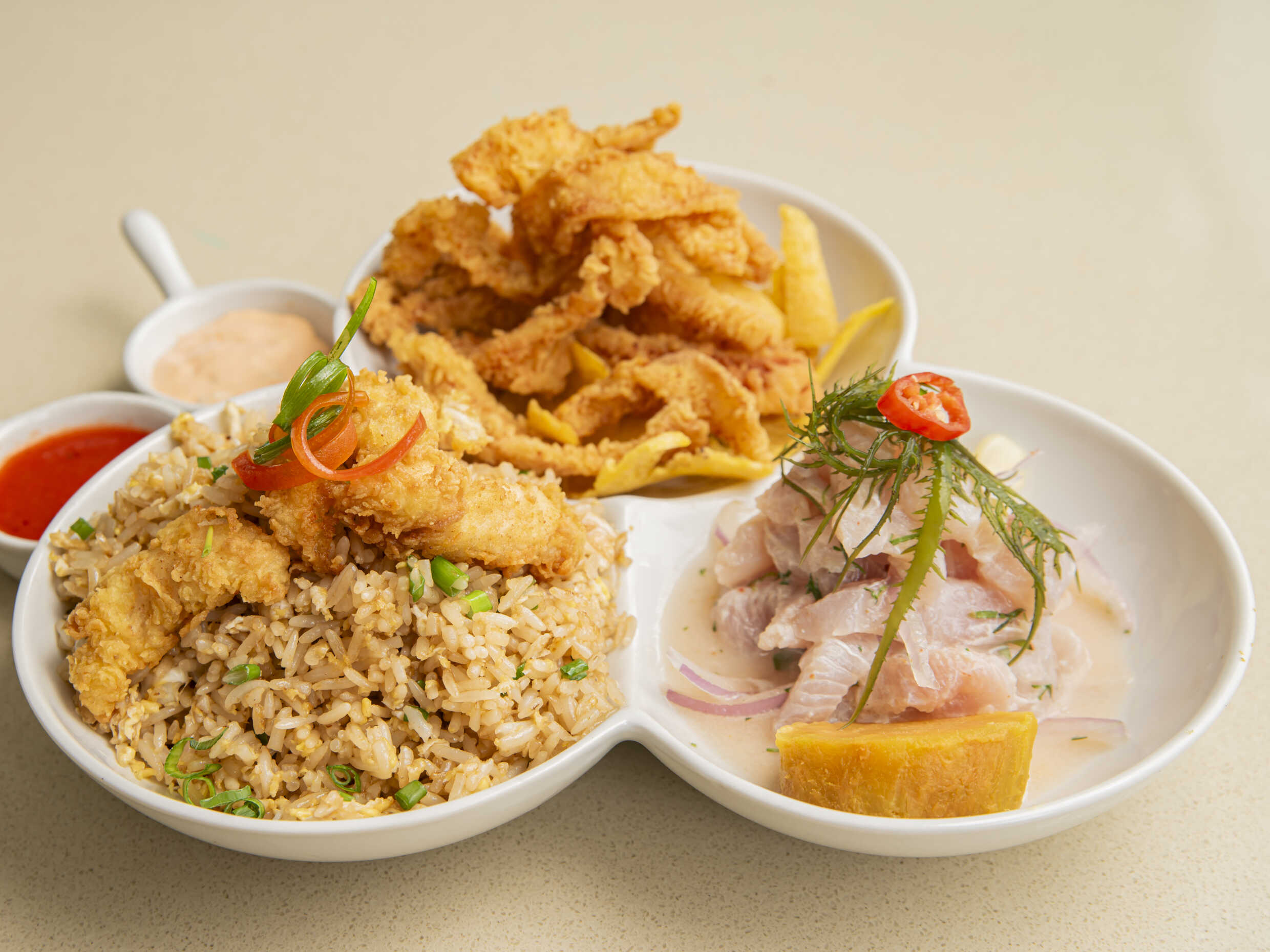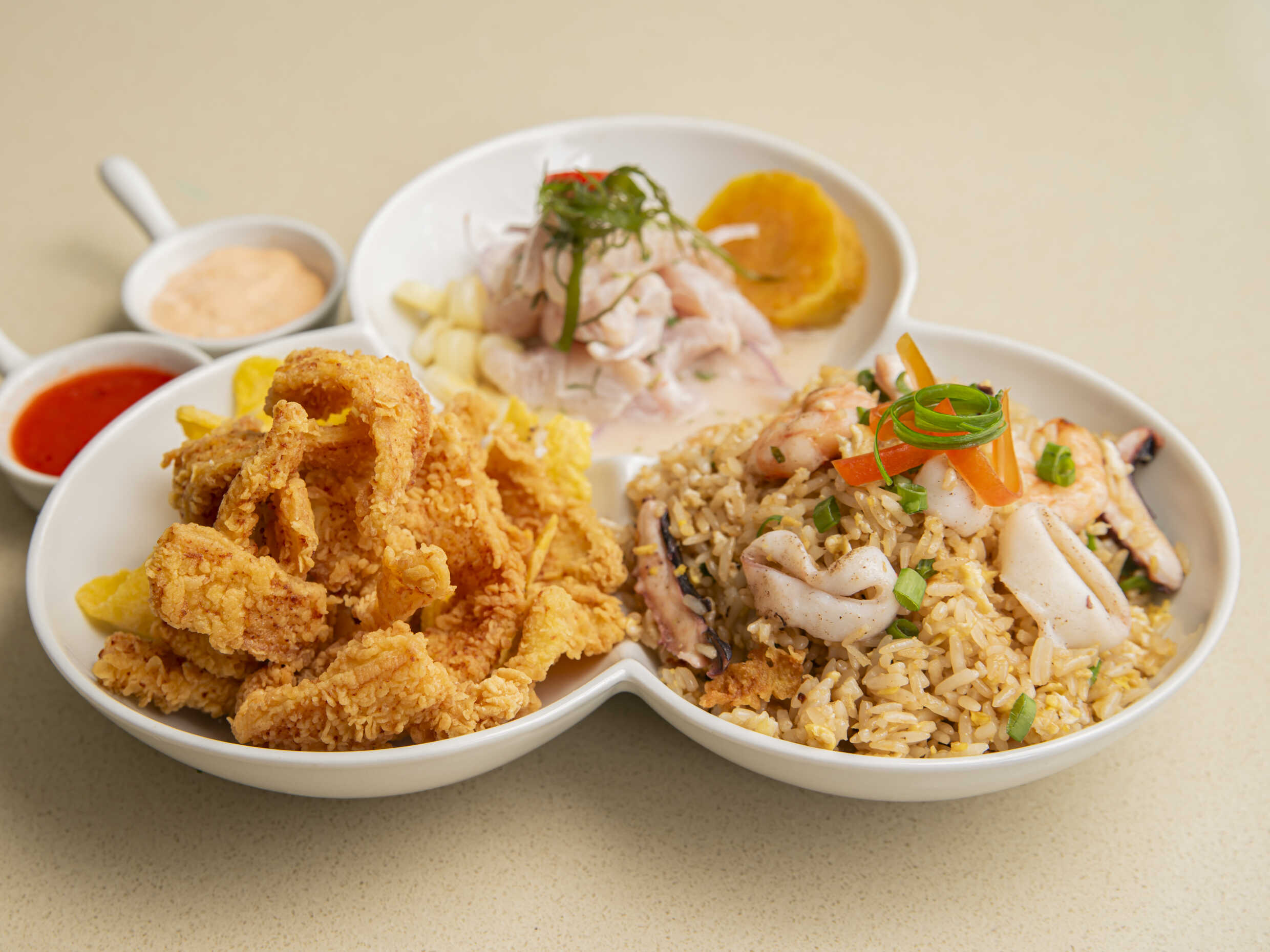 Ceviche de pescado, arroz chaufa de mariscos y chicharrón de pota.