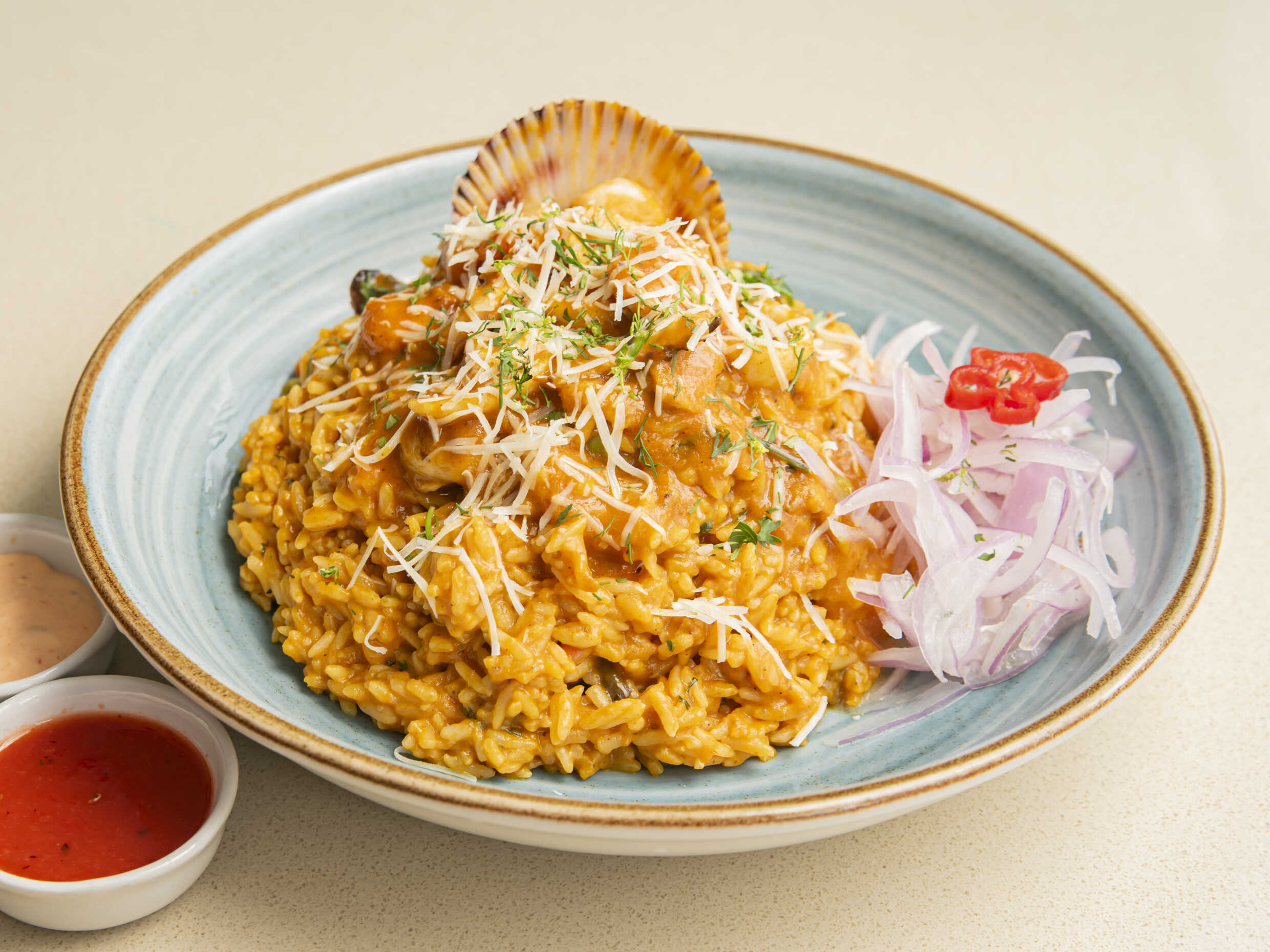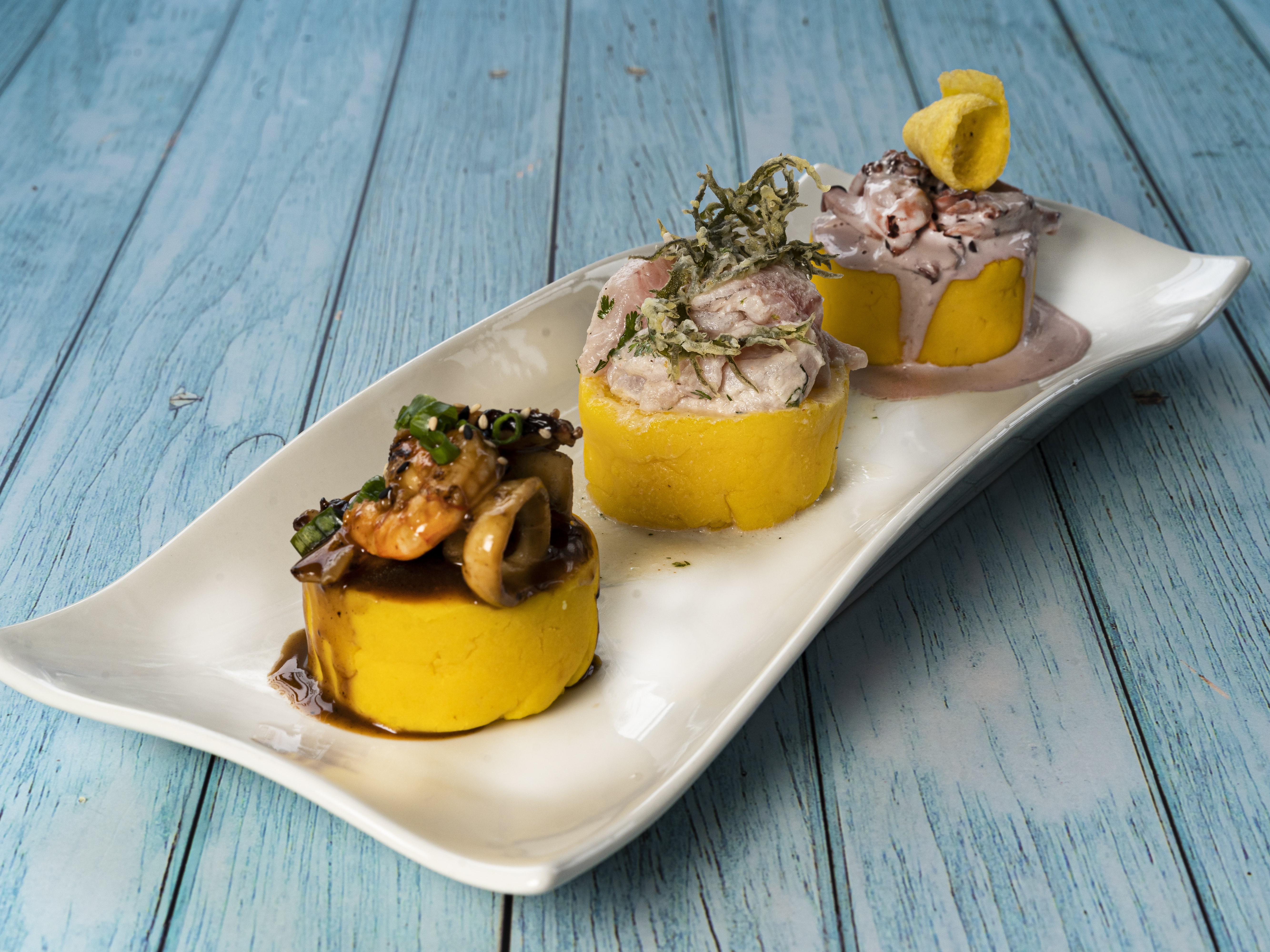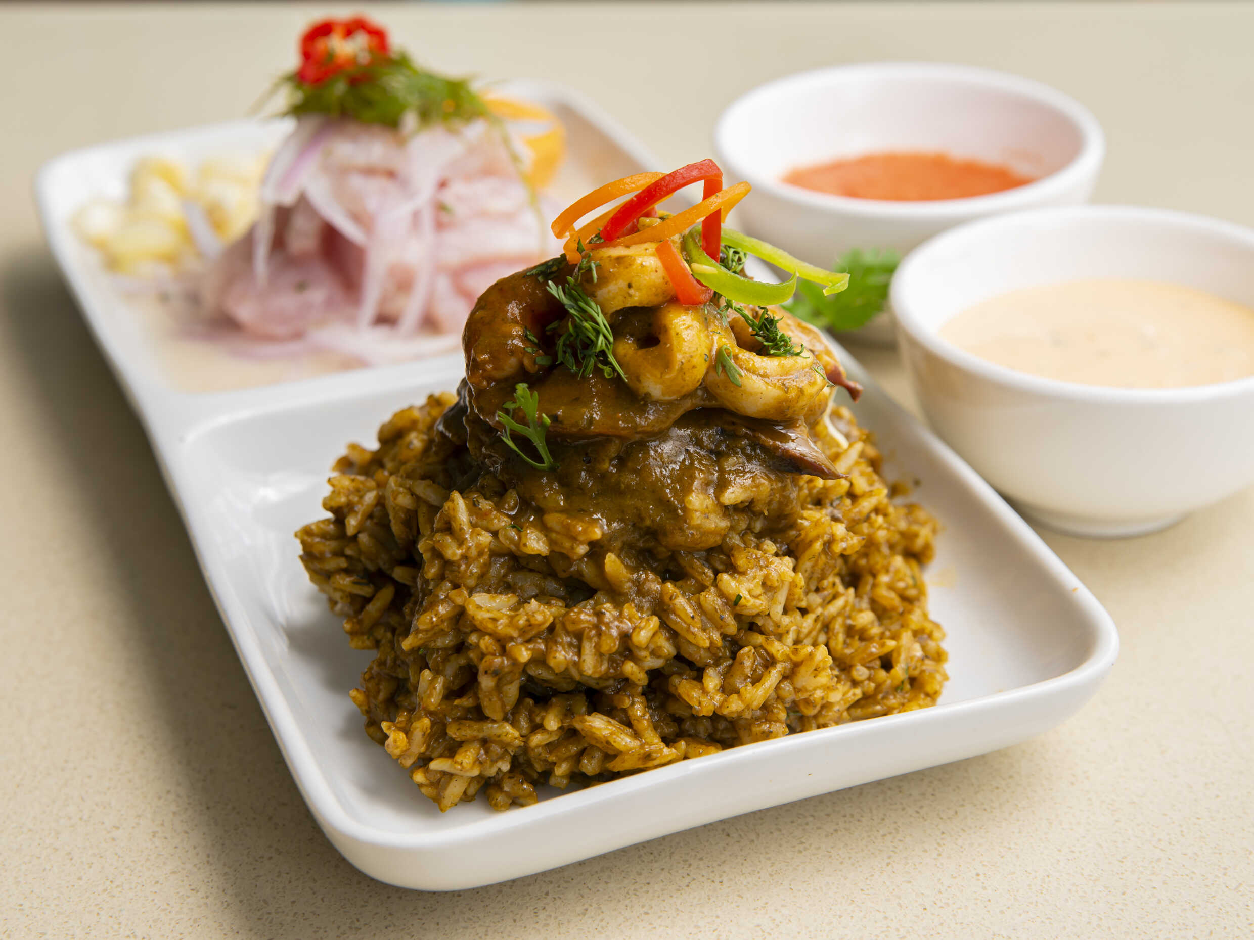 Ceviche de pescado, arroz meloso a base de salsa norteña con zapallo loche, mixtura de mariscos y chicharrón de pota.