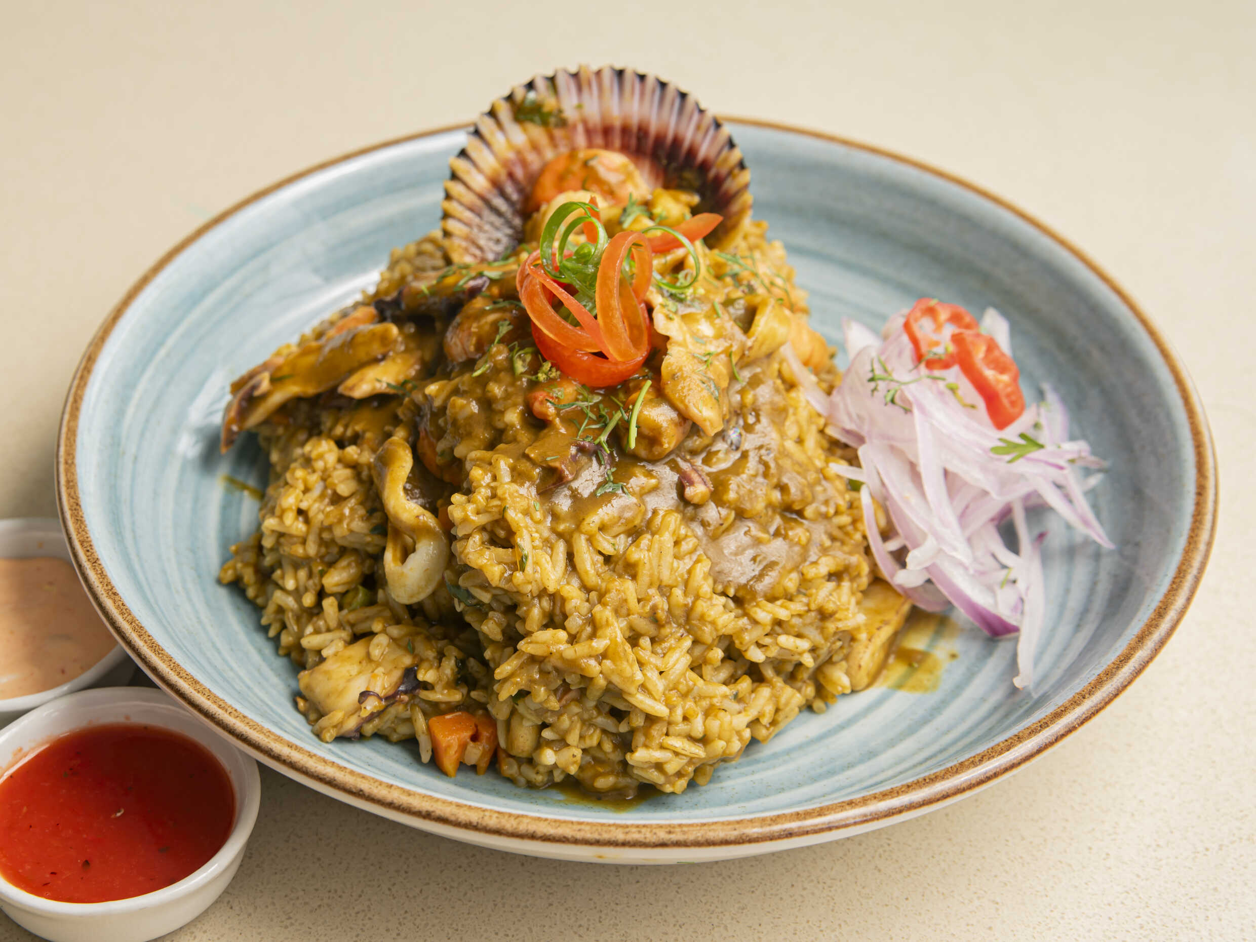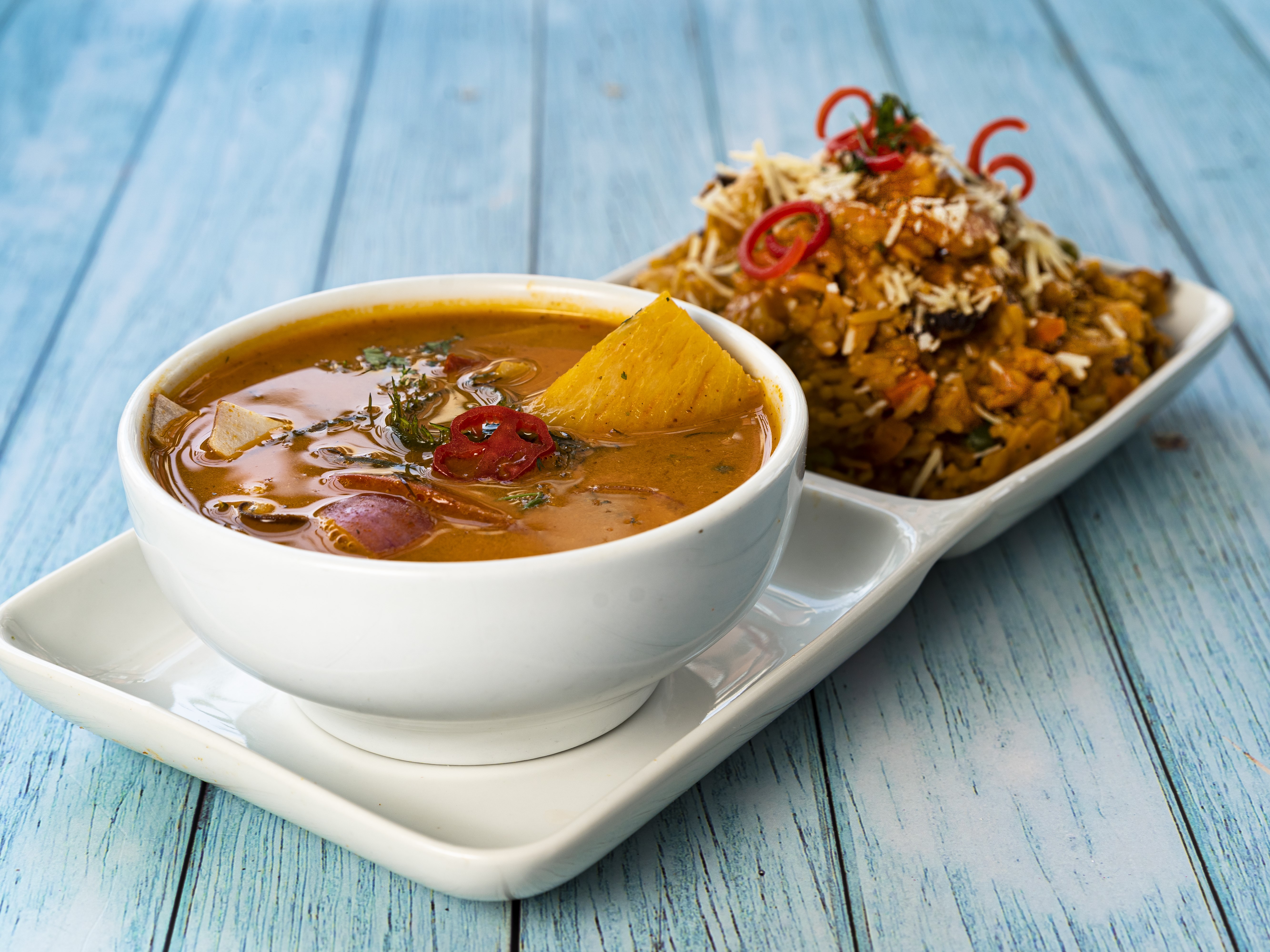 Nuestra potente parihuela de mariscos con nuestro delicioso arroz chaufa de mariscos salteados al wok