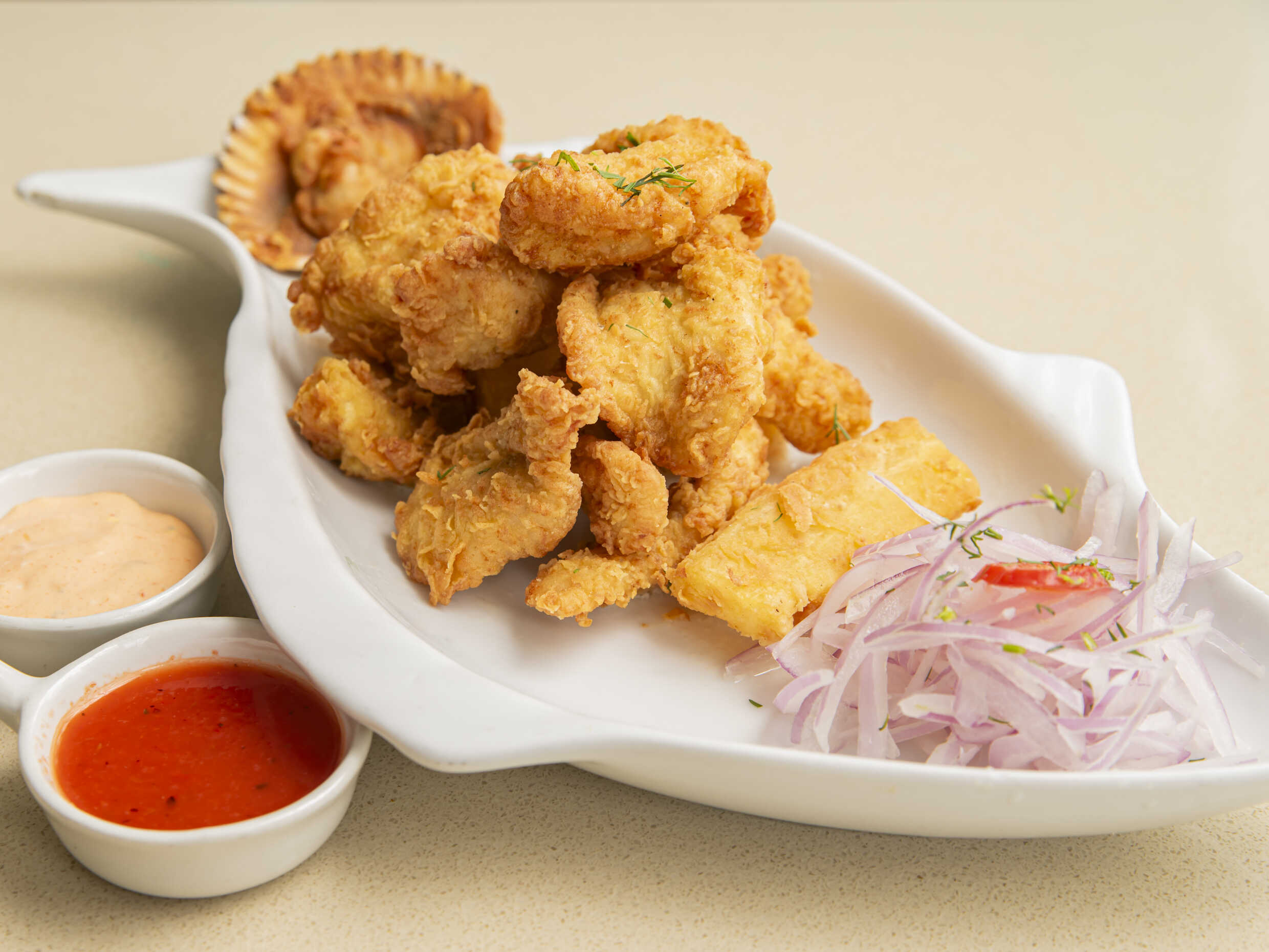 Ceviche de pescado clásico, choclo, camote más nuestro crocante chicharrón de pescado, sobre una cama de yucas fritas,