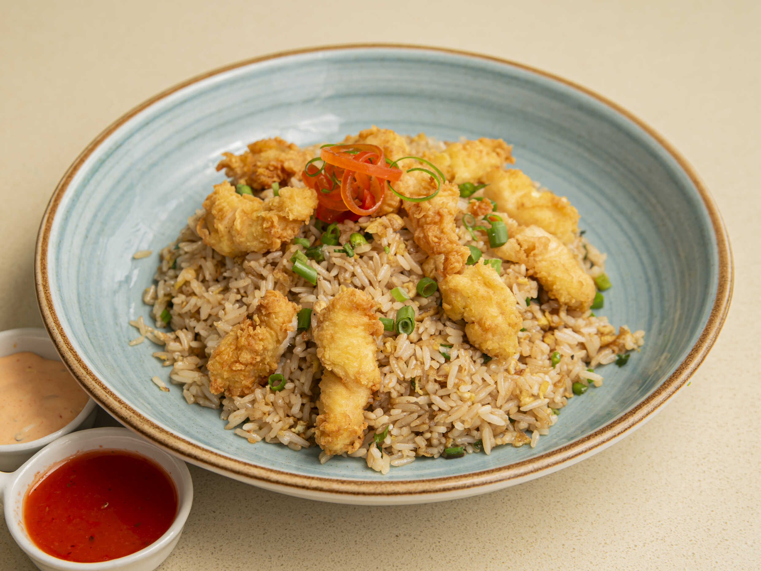 Arroz chaufa con trozos de pescado, sillao y cebolla china.