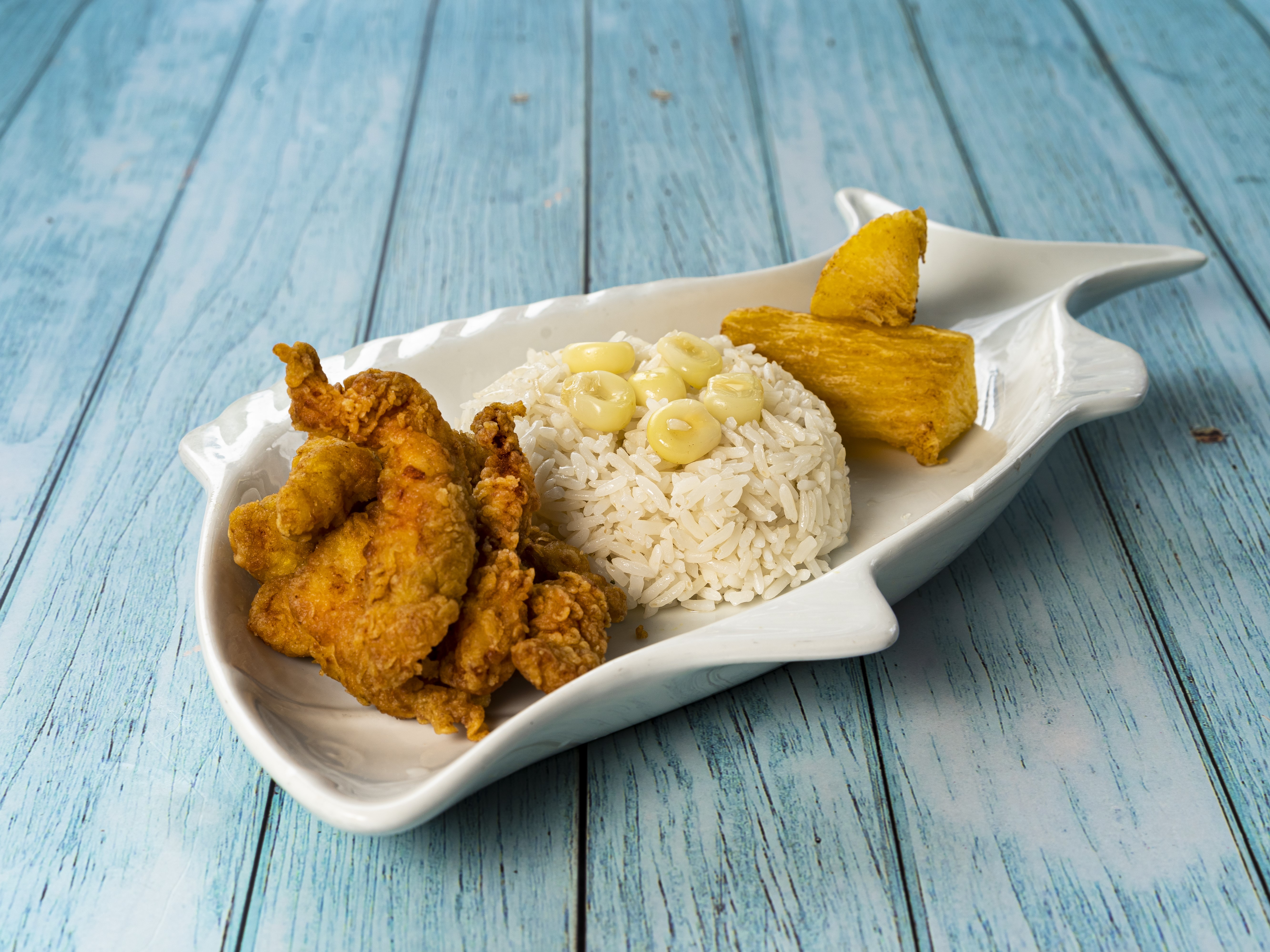 Chicharrón de pescado con yuquitas, arroz blanco y un vasito de chicha.
