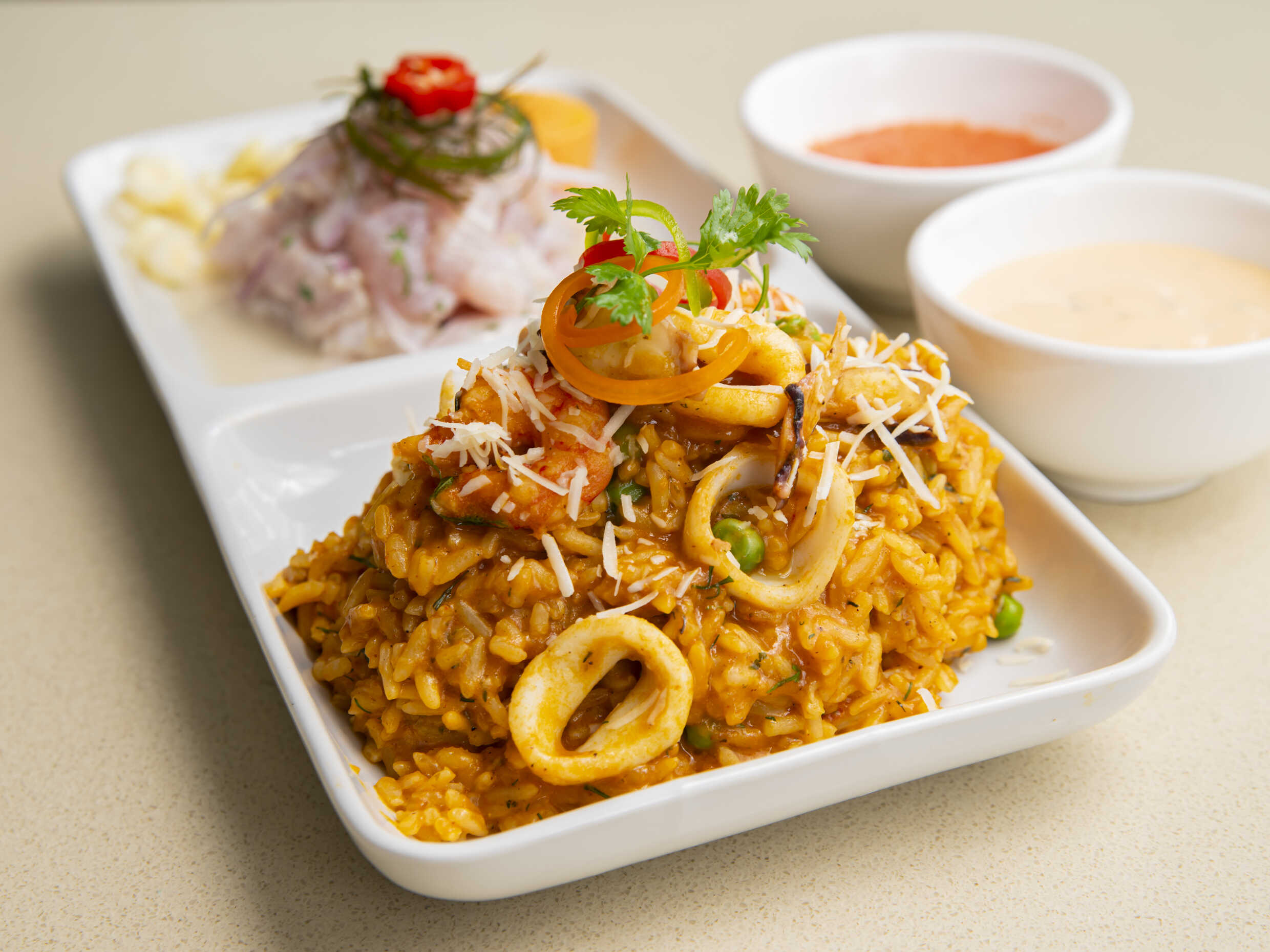 Ceviche de pescado, arroz con mariscos y chicharrón de pota.