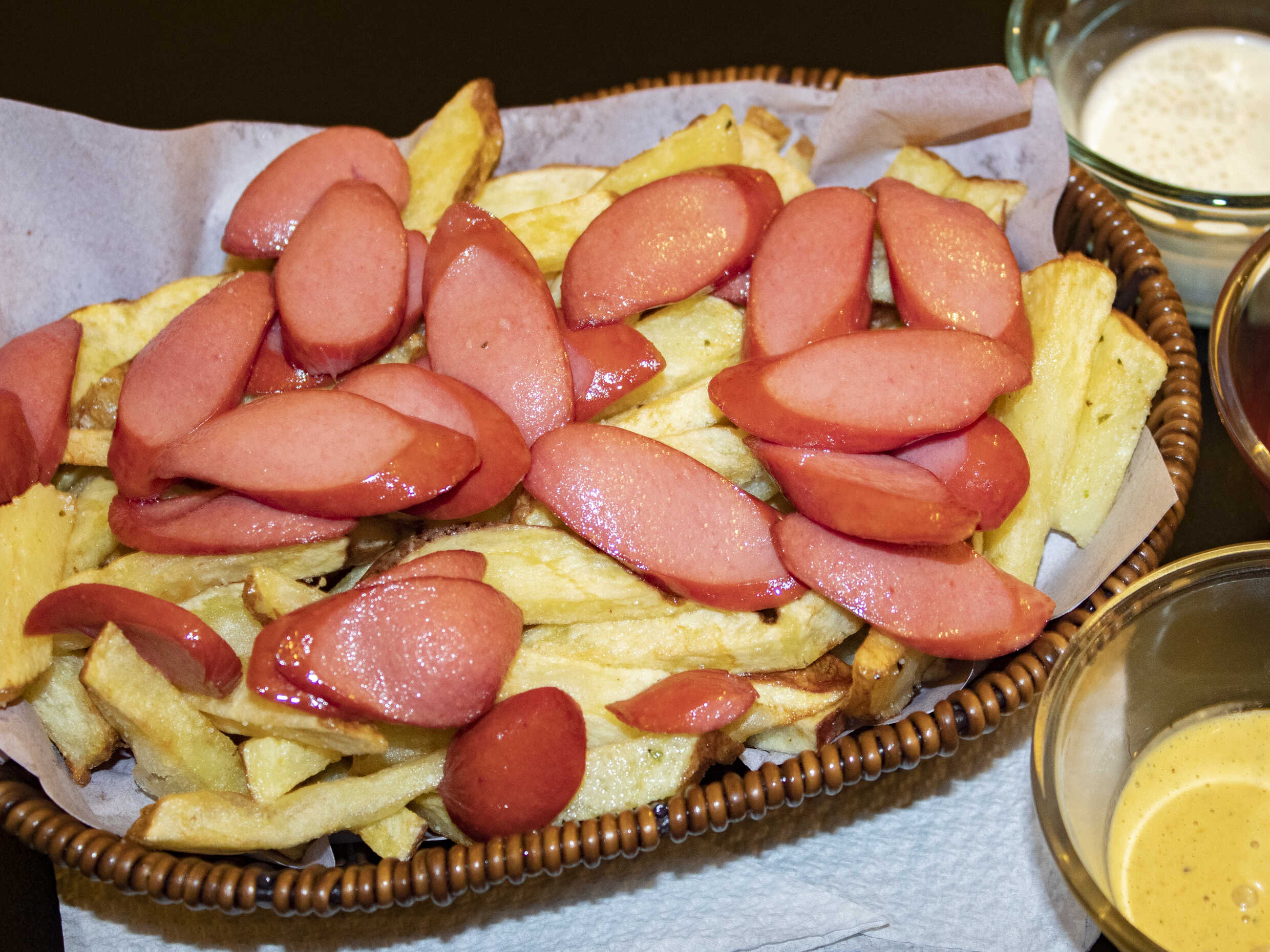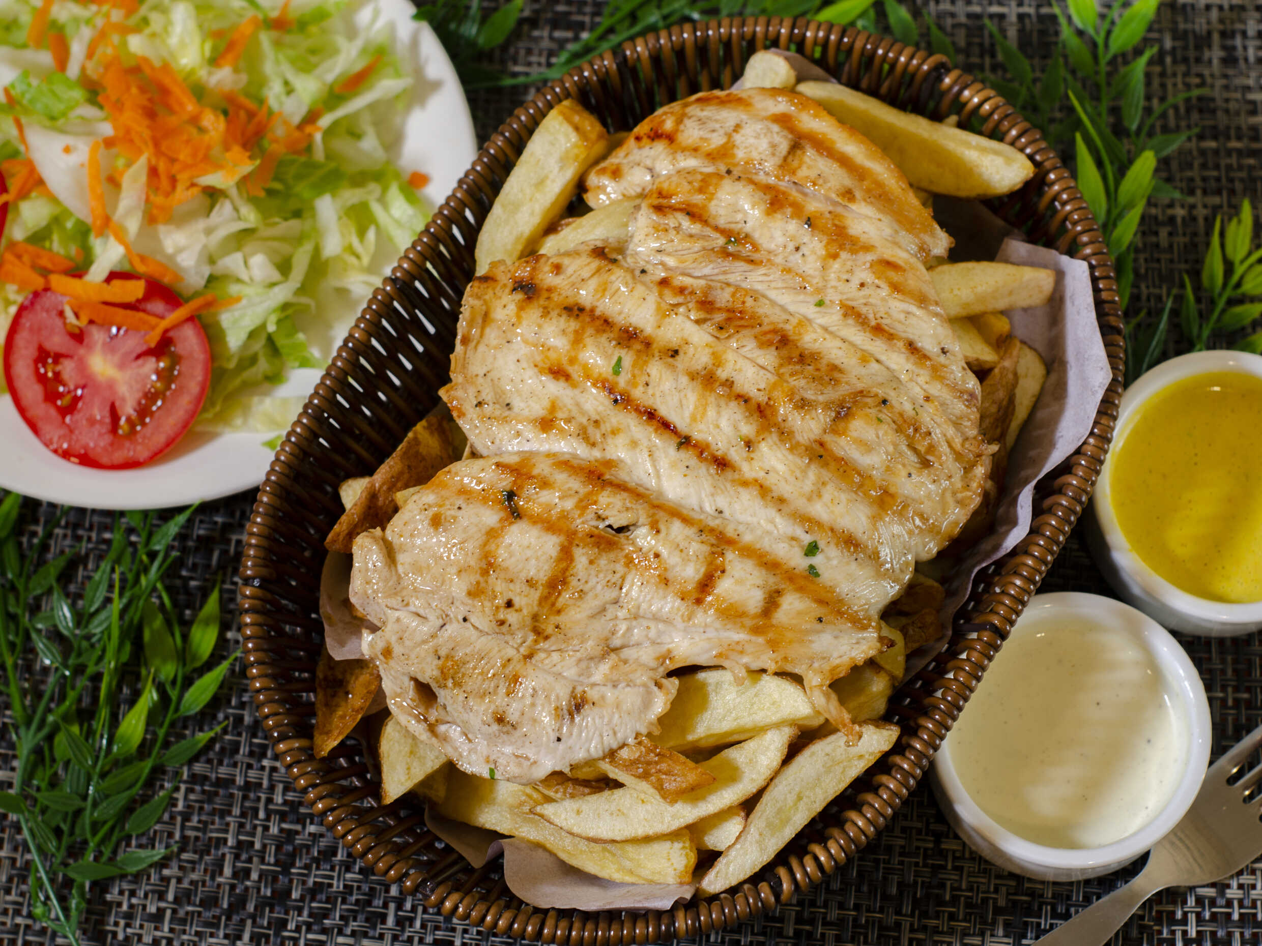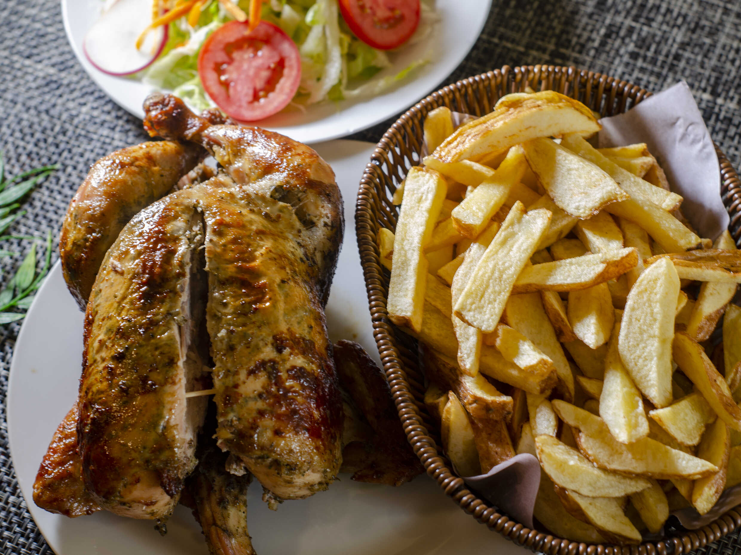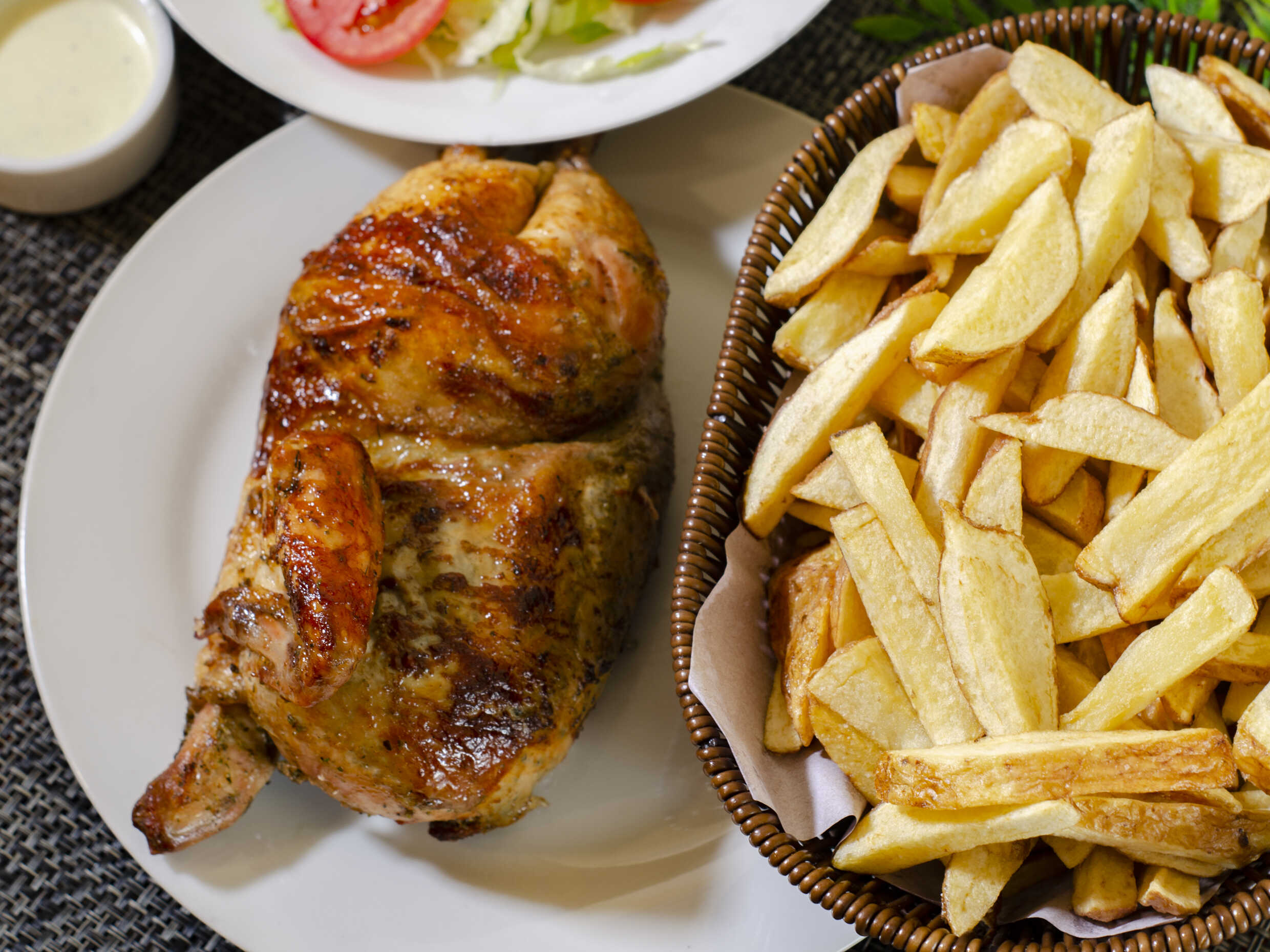 Un pollo, papas, ensalada y 1/4 de pollo adicional.