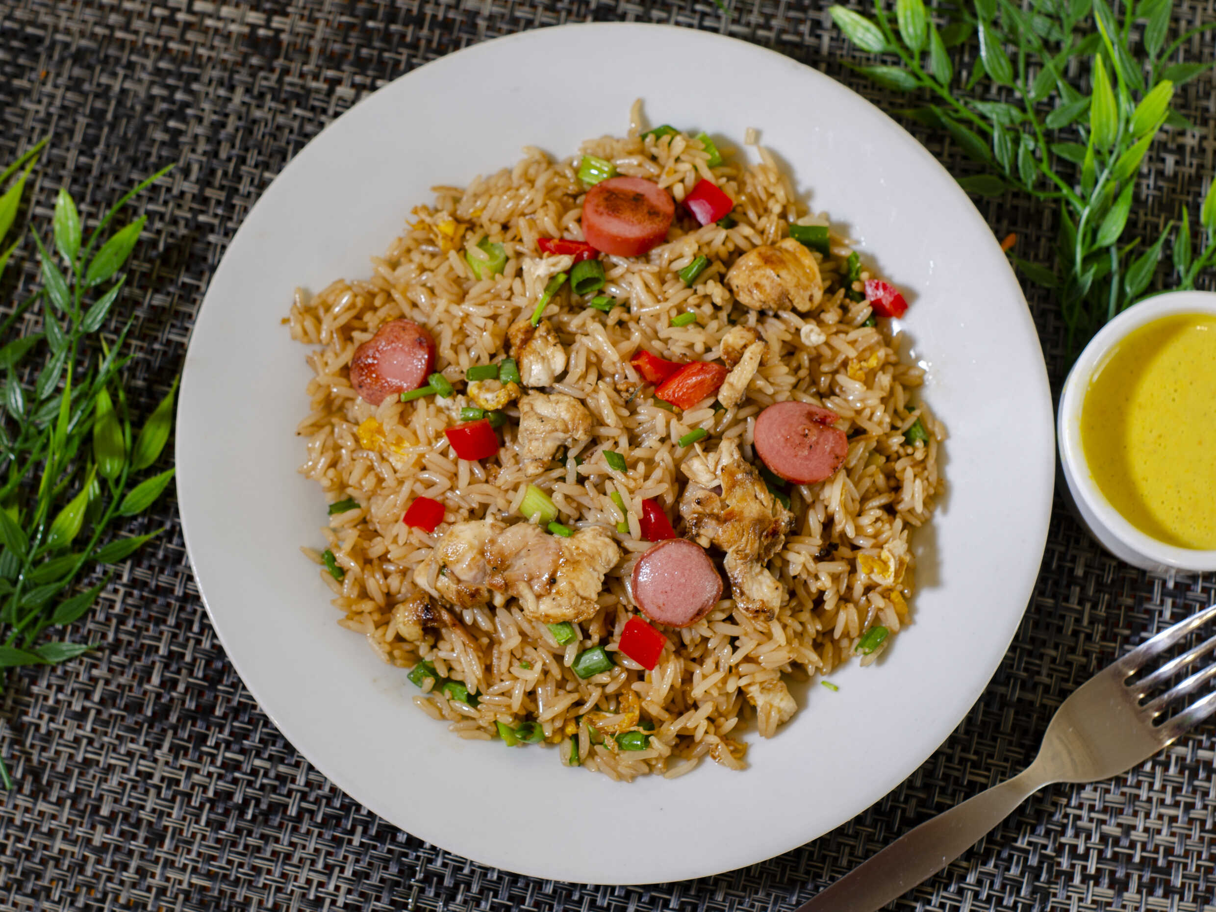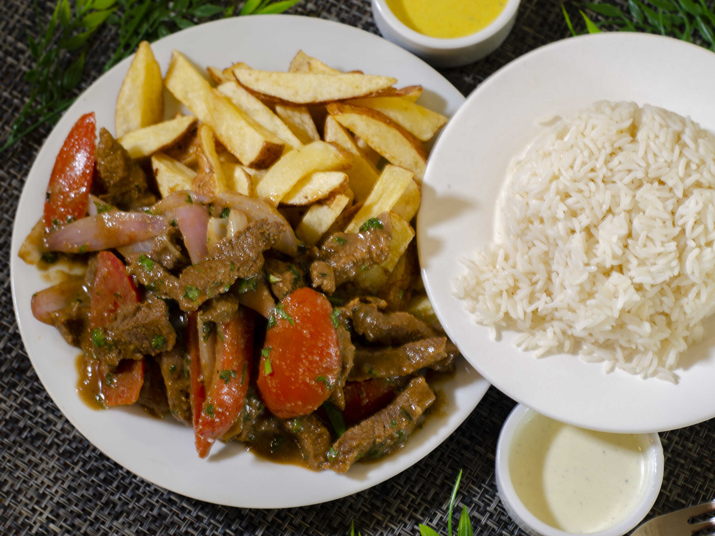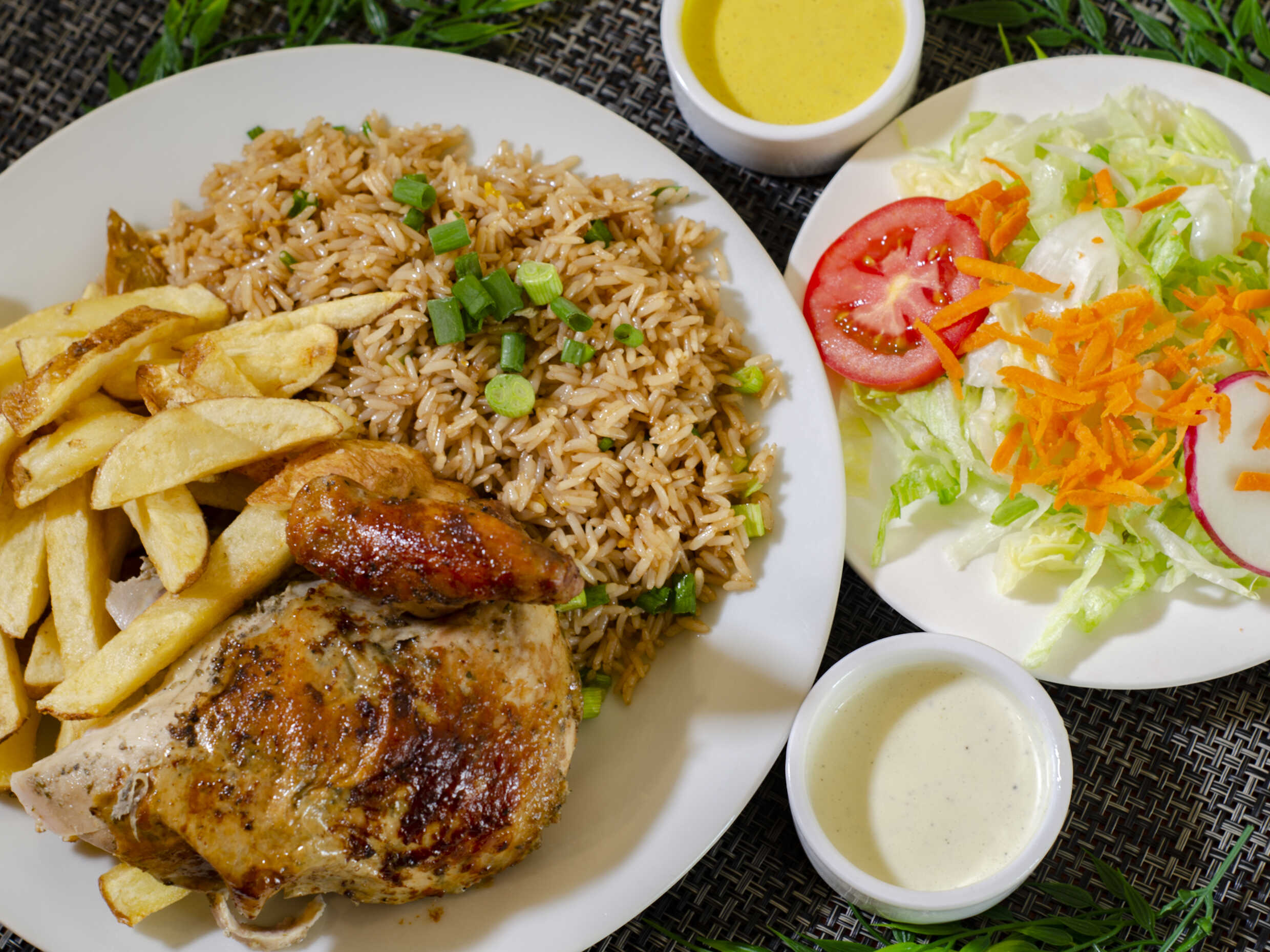 1/4 de pollo, arroz chaufa, papas y ensalada.