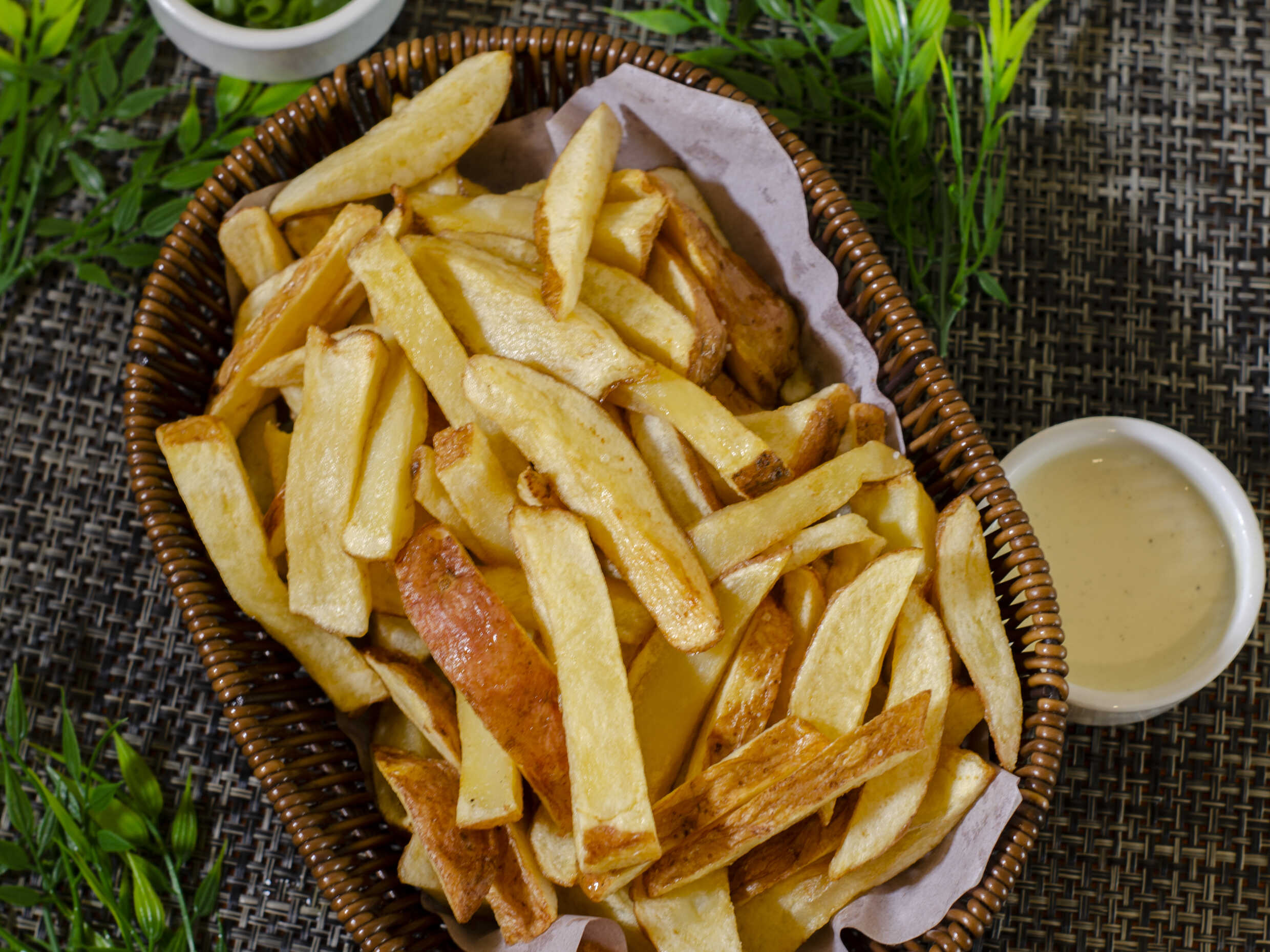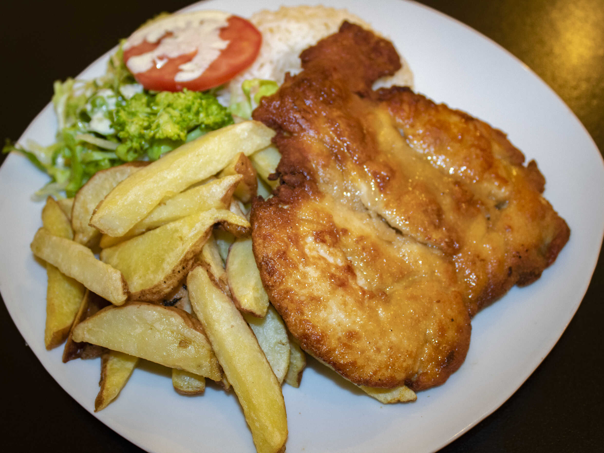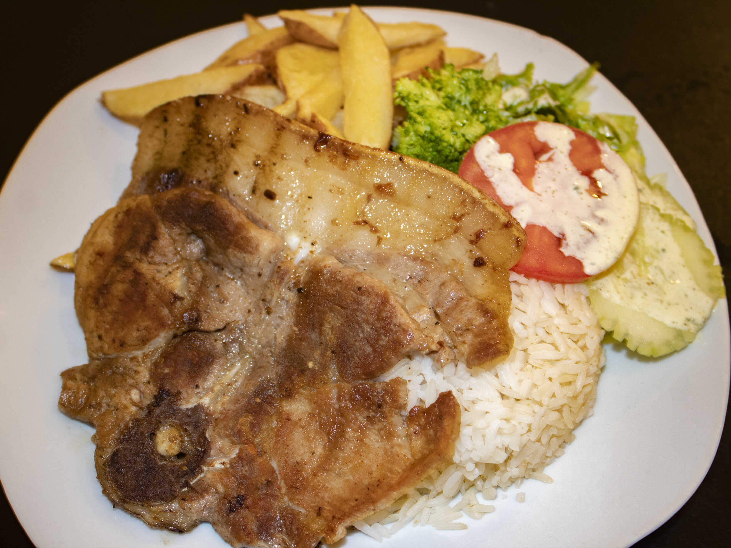 1/4 de pollo, arroz chaufa, papas y ensalada.