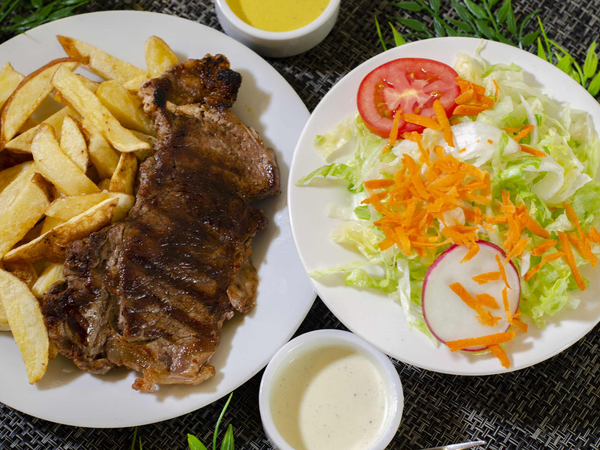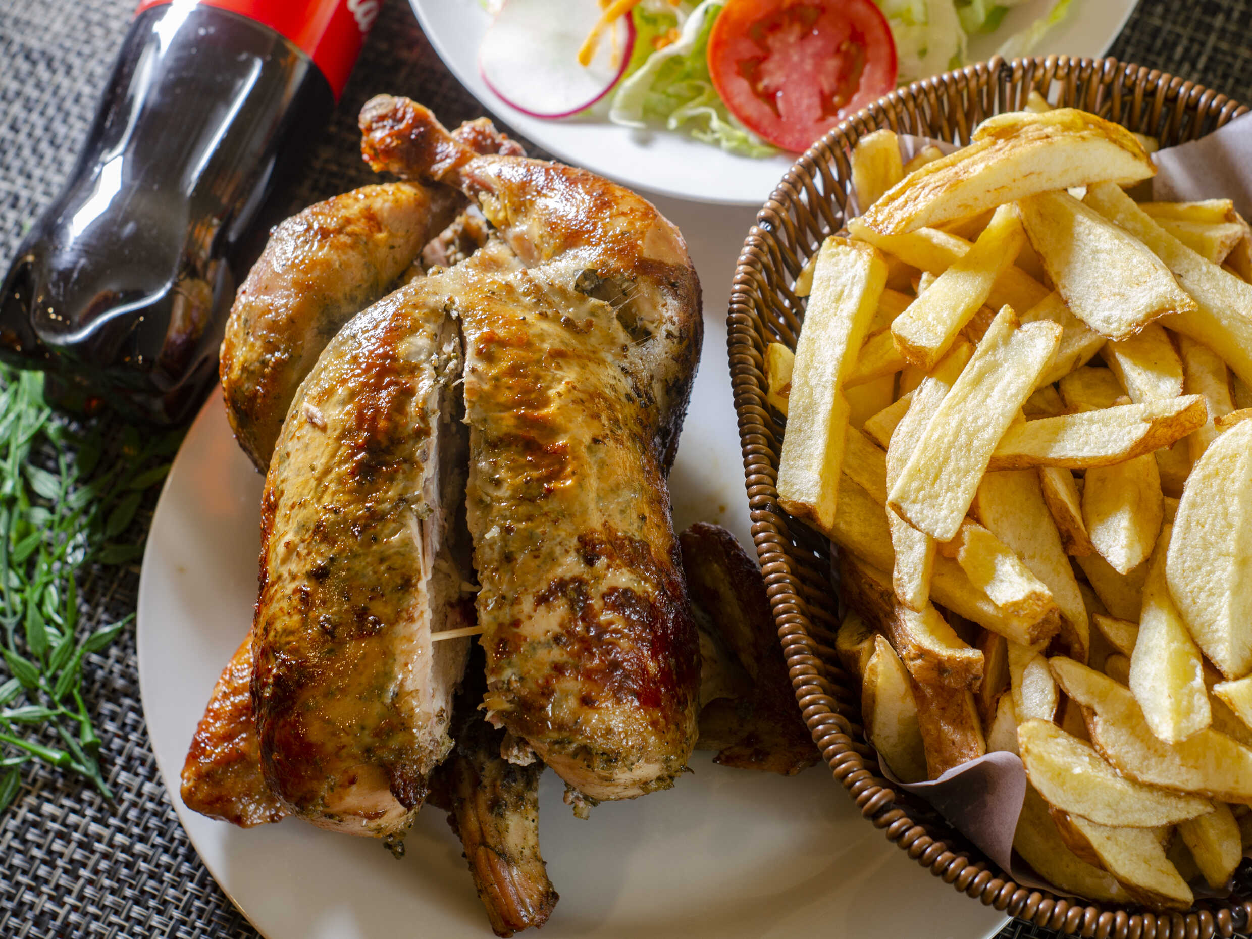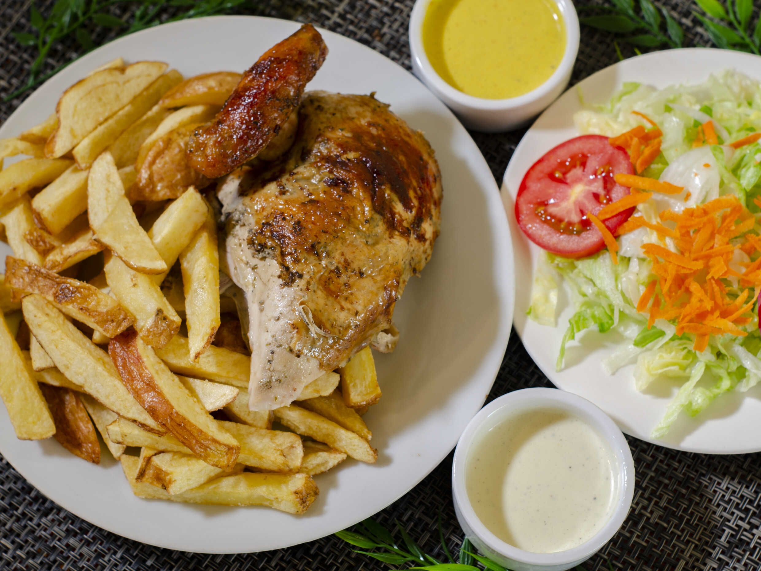 Un pollo, papas, ensalada y gaseosa de 1.5 L.