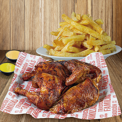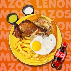 1/4 Pollo a la brasa, acompañado de crocantes papas fritas, ensalada fresca y cremas.
