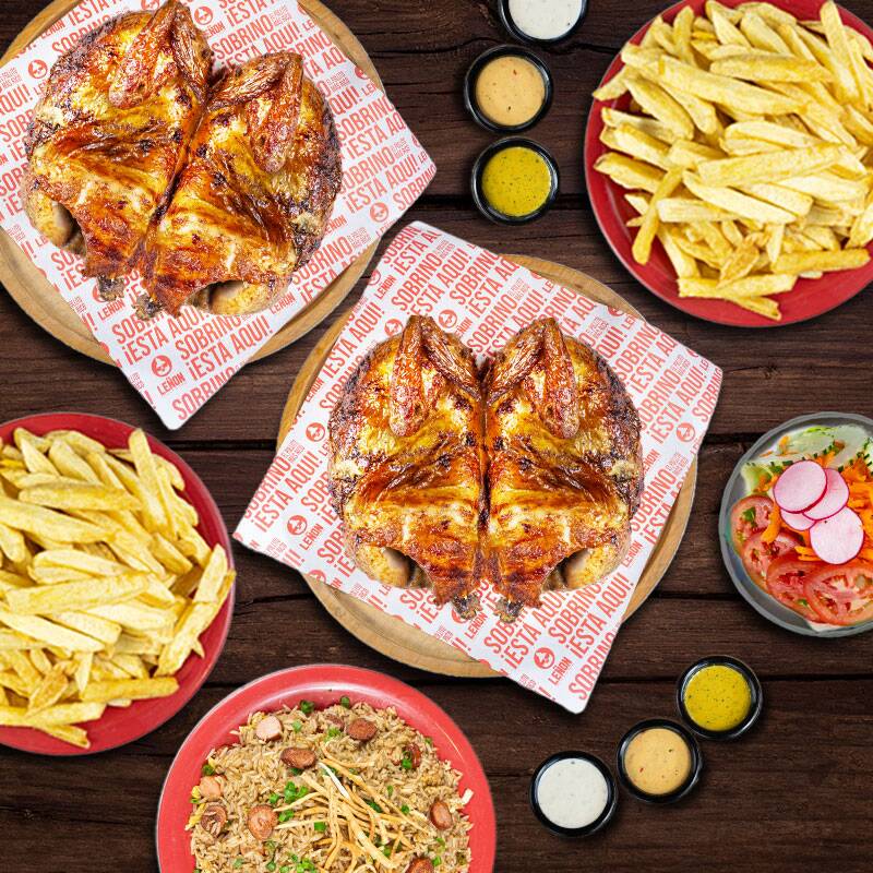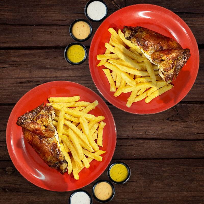 2 Pollos a la brasa acompañados de 2 porciones de papas fritas, ensalada de familiar y 1 chaufa de hot dog.
