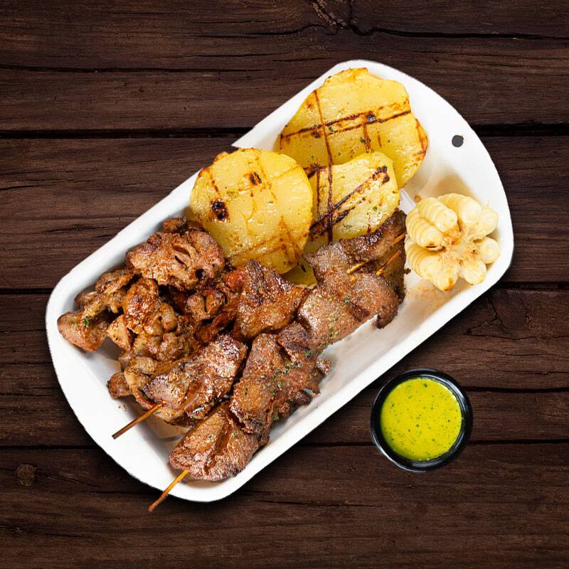2 Palitos de anticucho acompañado de porción de mollejitas, papa dorada y choclito ¡Buenazo!