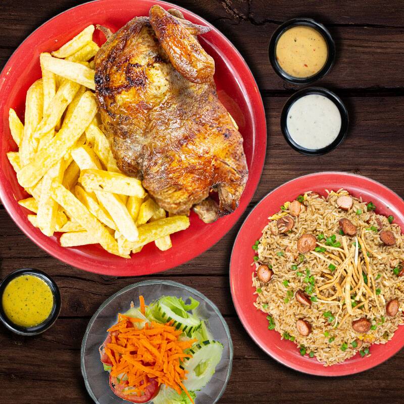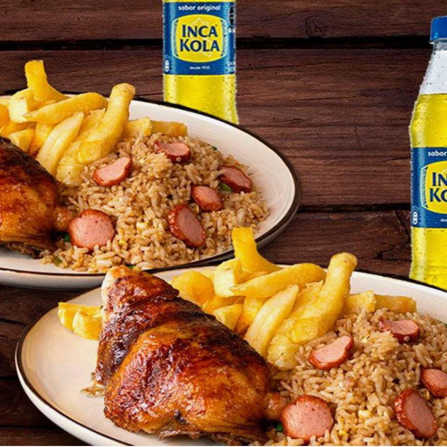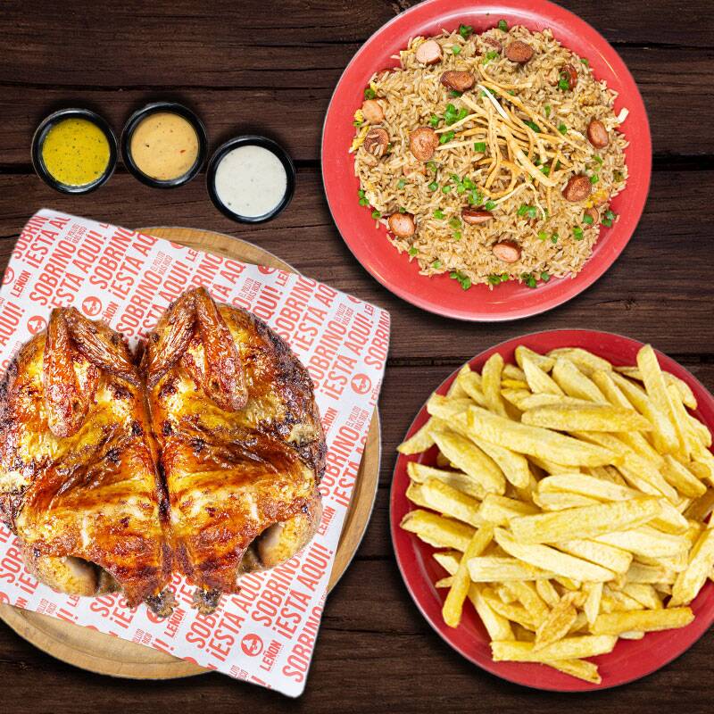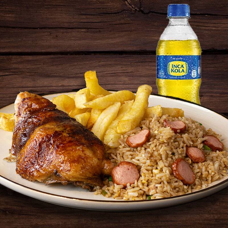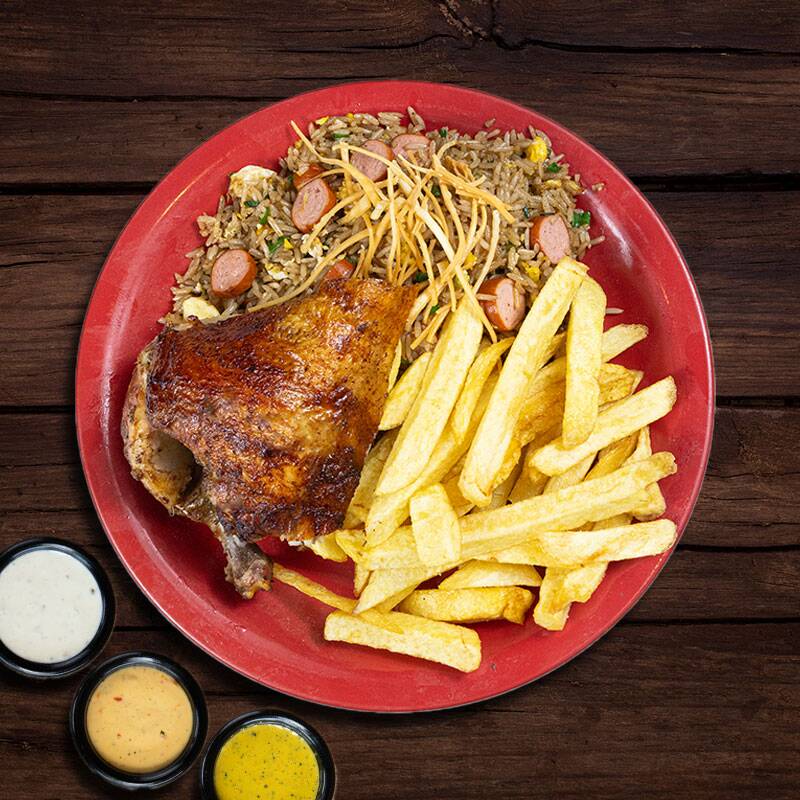 Nuestro tradicional 1/4 de pollo con papas fritas, acompañado con arroz chaufa.