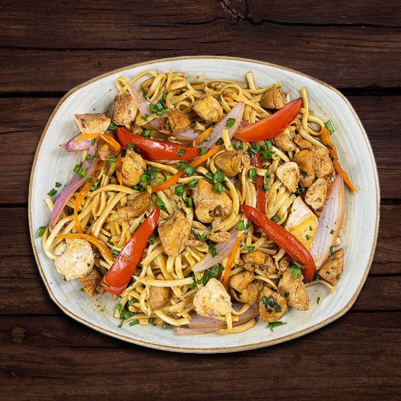 Tallarín saltado al wok con pollo y vegetales.