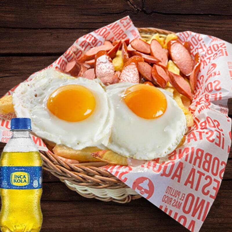 Trozos de hot dog, abundantes papas fritas, 2 huevos fritos, una gaseosa personal a elegir y 2 cremas.